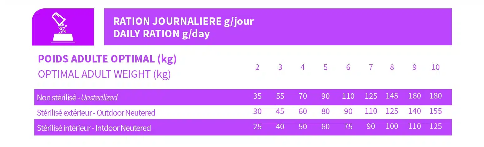 COMPOSITION : Farine de saumon 27%, protéine de maïs, maïs, riz blanc de Camargue, graisse de canard, blé, levure de bière 5%, hydrolysat de protéines animales 5%, lignocellulose 3%, huile de tournesol linoléique vierge biologique 2.2%, pulpe de betterave, chlorure de potassium, citrate de potassium, graines de bourrache, feuilles d’Aloé Vera (écorce, pulpe), graines de chia, extraits de levures Saccharomyces cerevisiae (riche en β-Glucanes et MOS), glucosamine (origine marine), huile de poisson, inuline de chicorée (FOS), chitosan, feuilles d’artichaut, sulfate de chondroïtine.