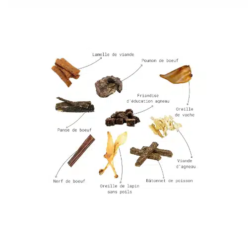 • Soutien à la dentition  : les friandises comme les oreilles de vache et les nerfs de bœuf aident à apaiser les gencives sensibles des chiots en période de dentition, favorisant le développement sain de leurs dents.