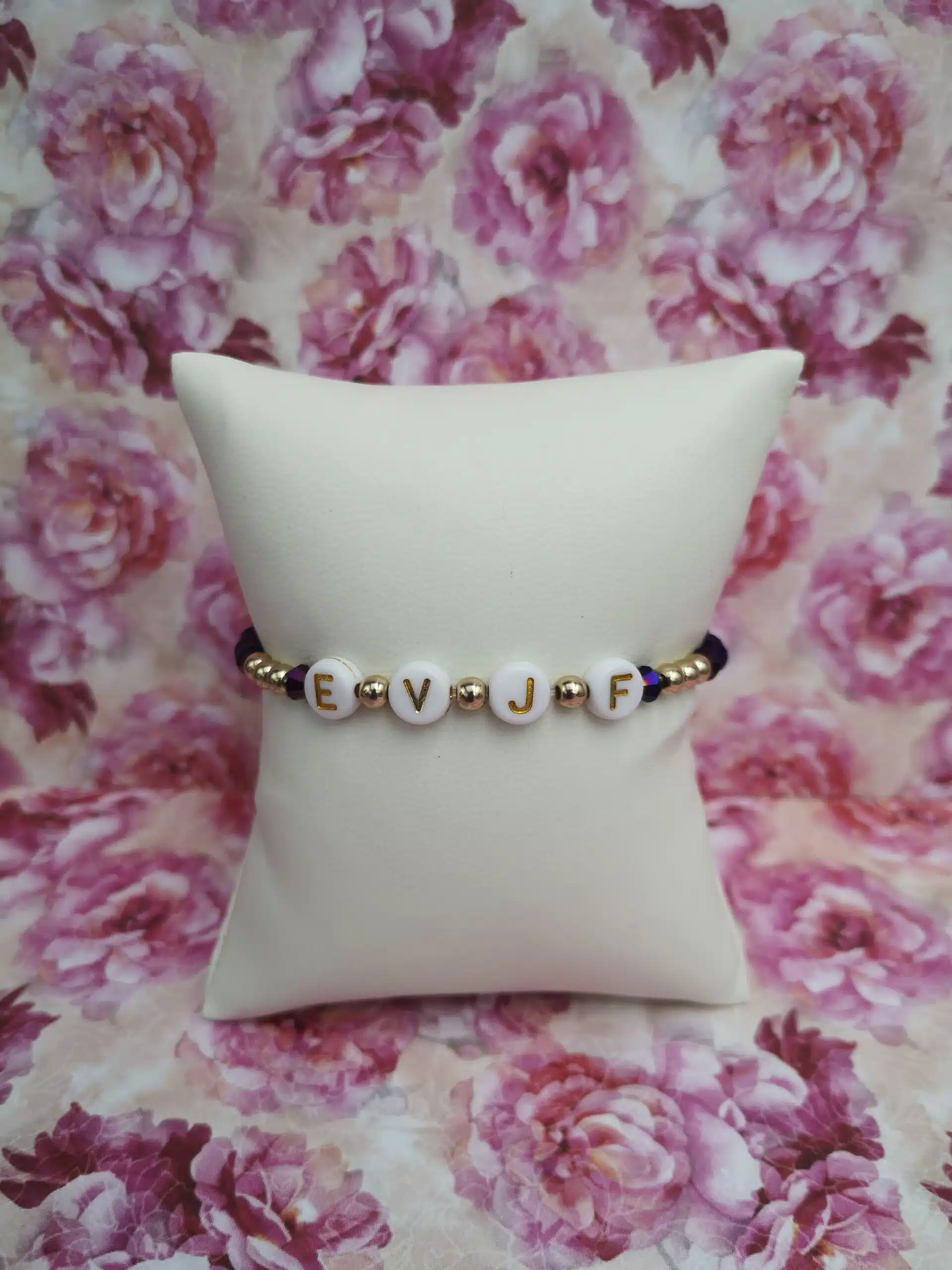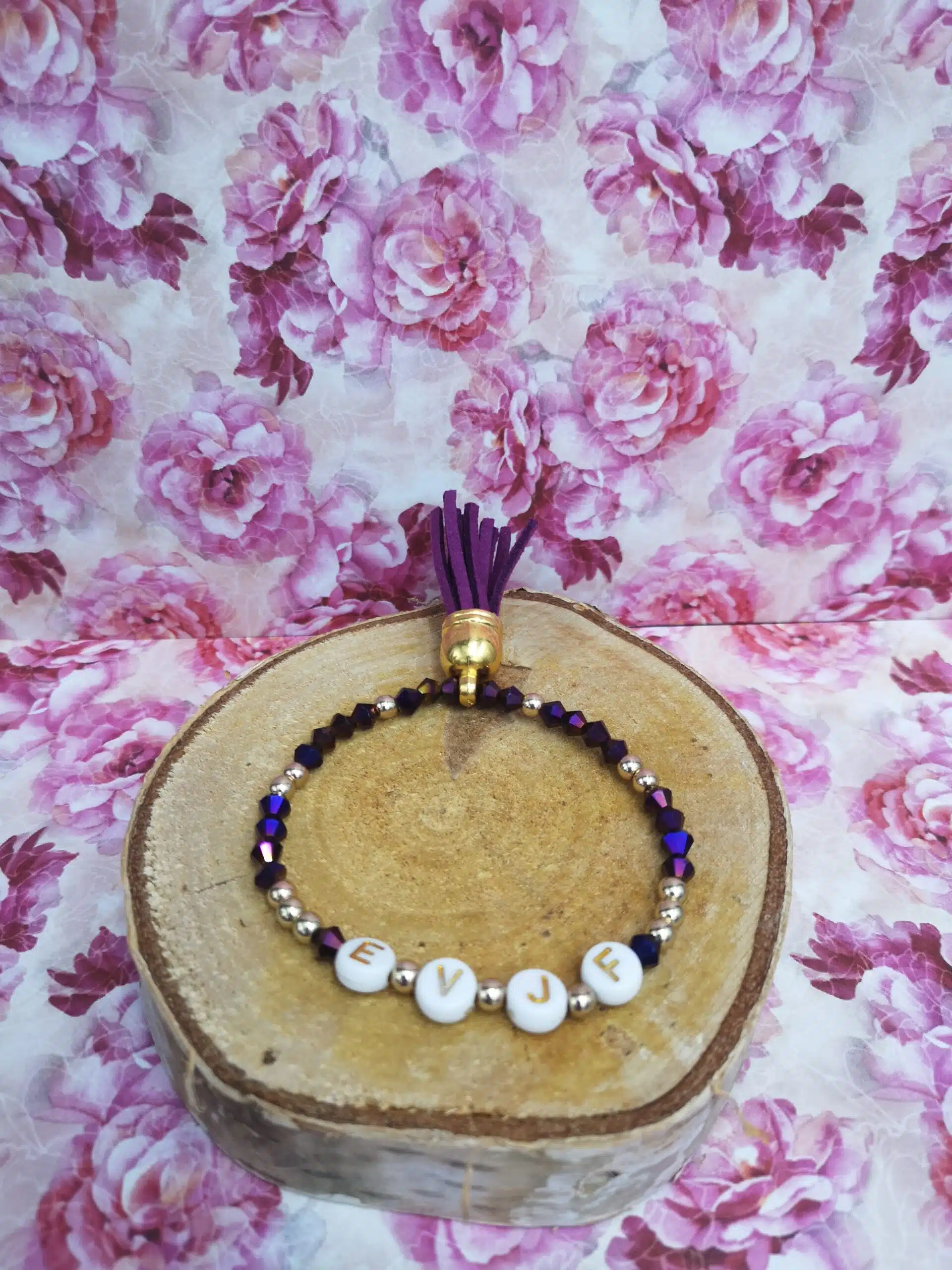 Célébrez un Enterrement de Vie de Jeune Fille (EVJF) de manière unique et mémorable avec ce bracelet étincelant. Élégamment conçu, ce bijou dévoile le mot “EVJF” grâce à des perles dorées et violettes, offrant un contraste riche et vibrant. Un pompon doux aux teintes violettes et dorées ajoute une touche finale sophistiquée, faisant de ce bracelet un véritable accroche-regard.