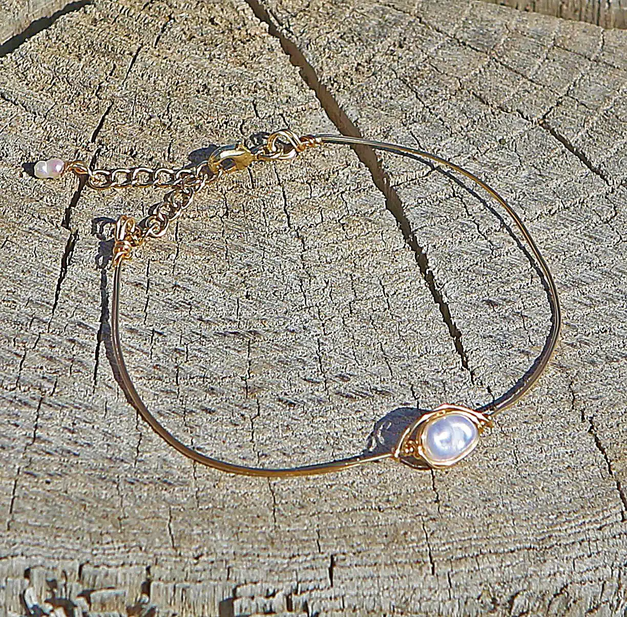 Une perle d’eau douce délicatement “sertie” de fil sauvage, se mariant à merveille avec les classiques de “La Plagette”. J ‘ai voulu rajouter une touche rock à la chaine d’extension qui vous permet de régler votre bracelet… avec une perle et une chaîne a large maillon, si tendance . Conquise ?