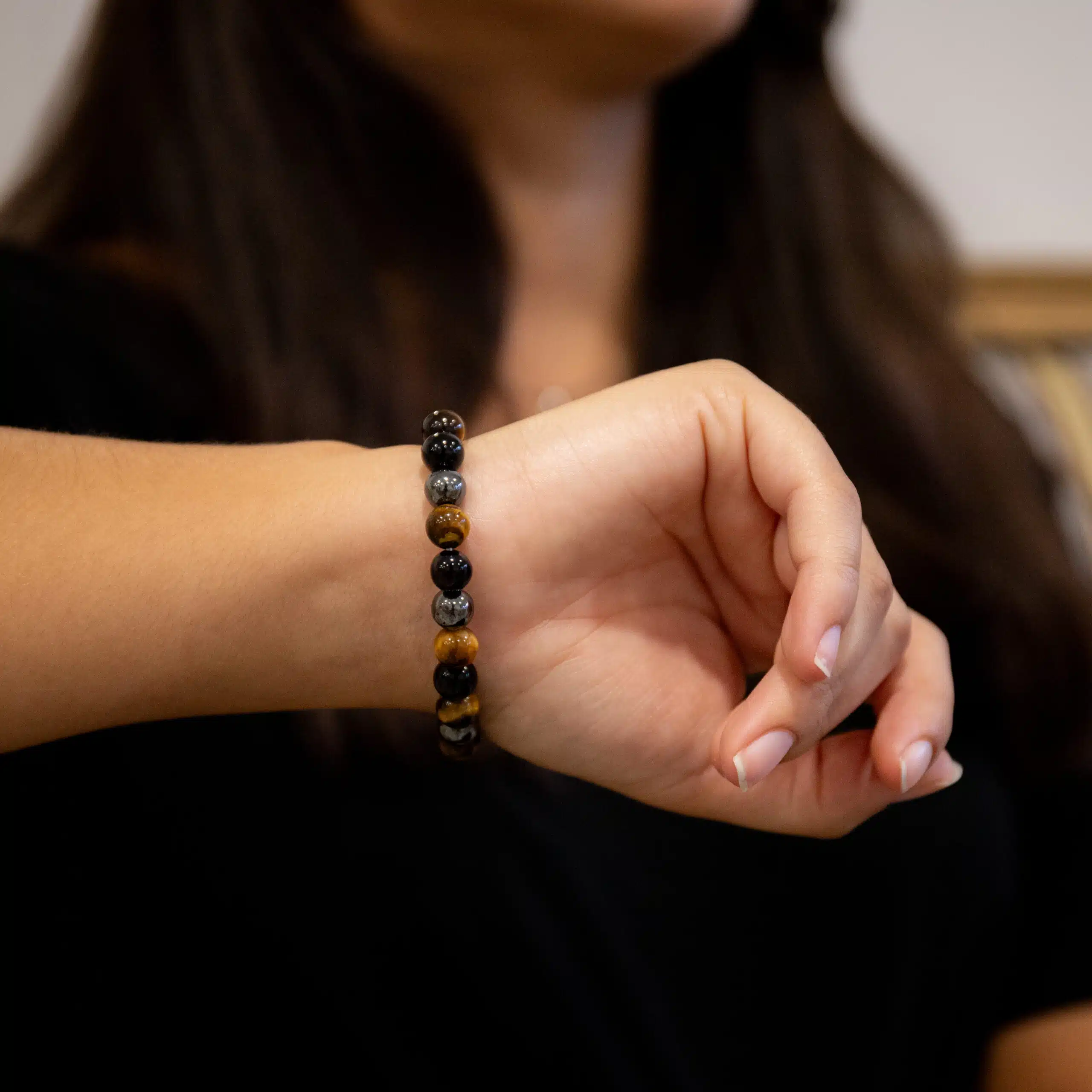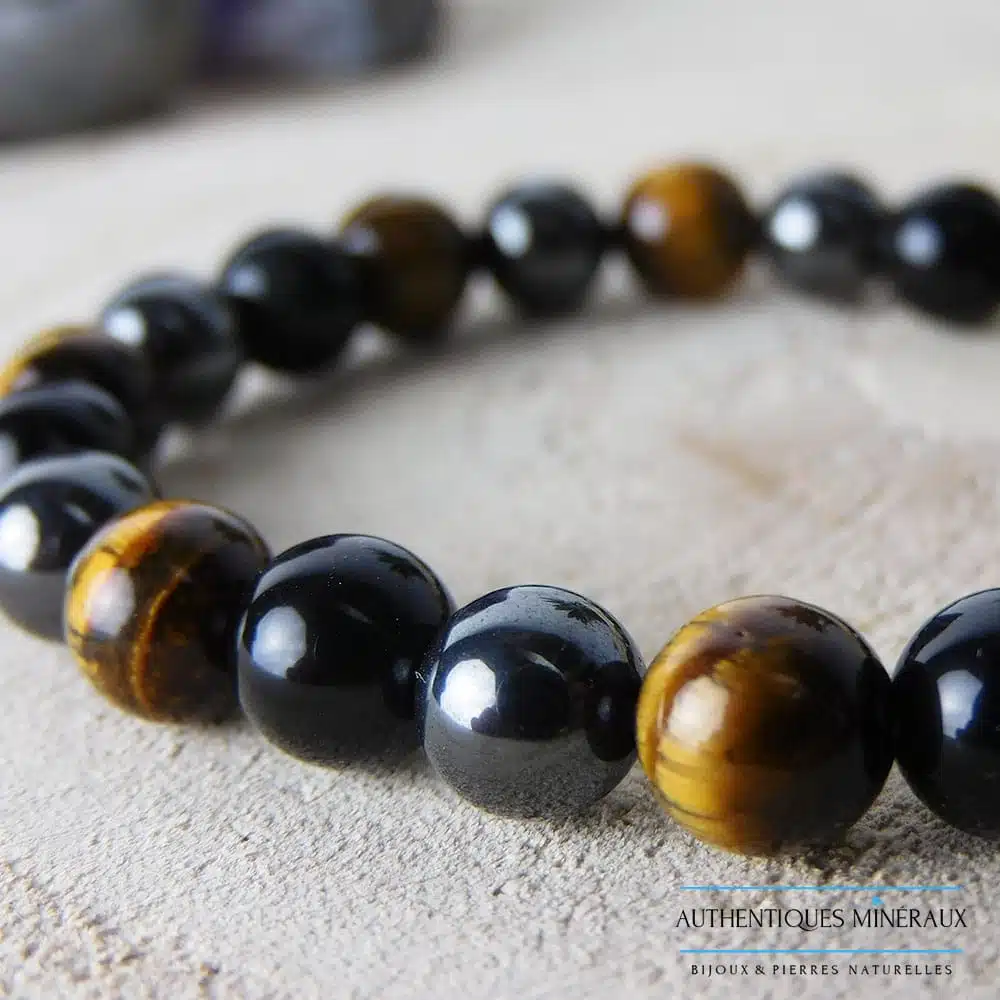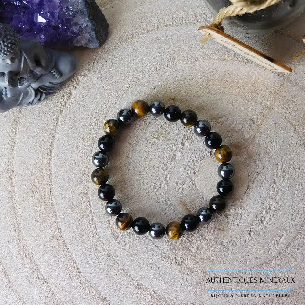 Bracelet Triple Protection fait en œil de tigre, hématite et obsidienne avec des pierres naturelles de grade A, confectionné à la main. Parfait pour ajouter une touche d’élégance et de sophistication à votre poignet.