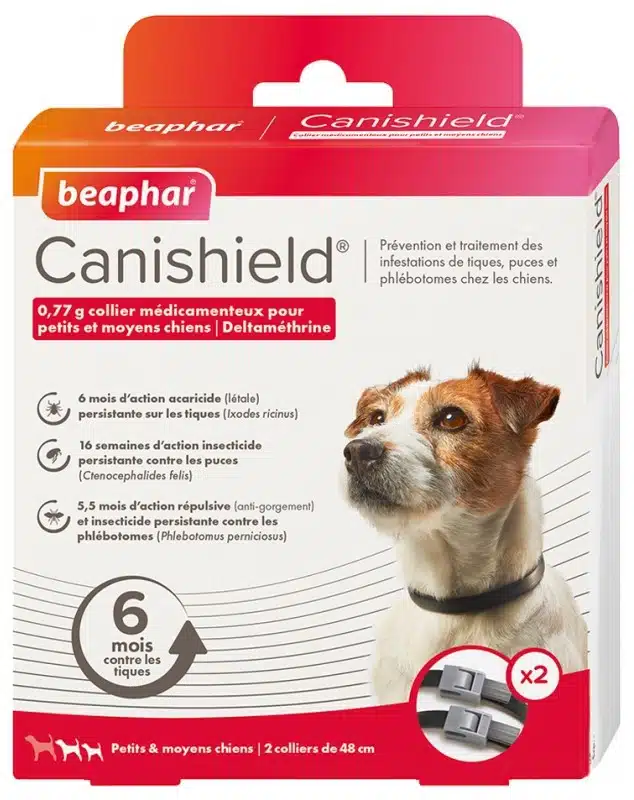 Collier antiparasitaire pour chiens de petite et moyenne taille (48 cm), offrant une protection de 6 mois contre les tiques, 16 semaines contre les puces et 5,5 mois contre les phlébotomes. Contient 0,77 g de deltaméthrine.