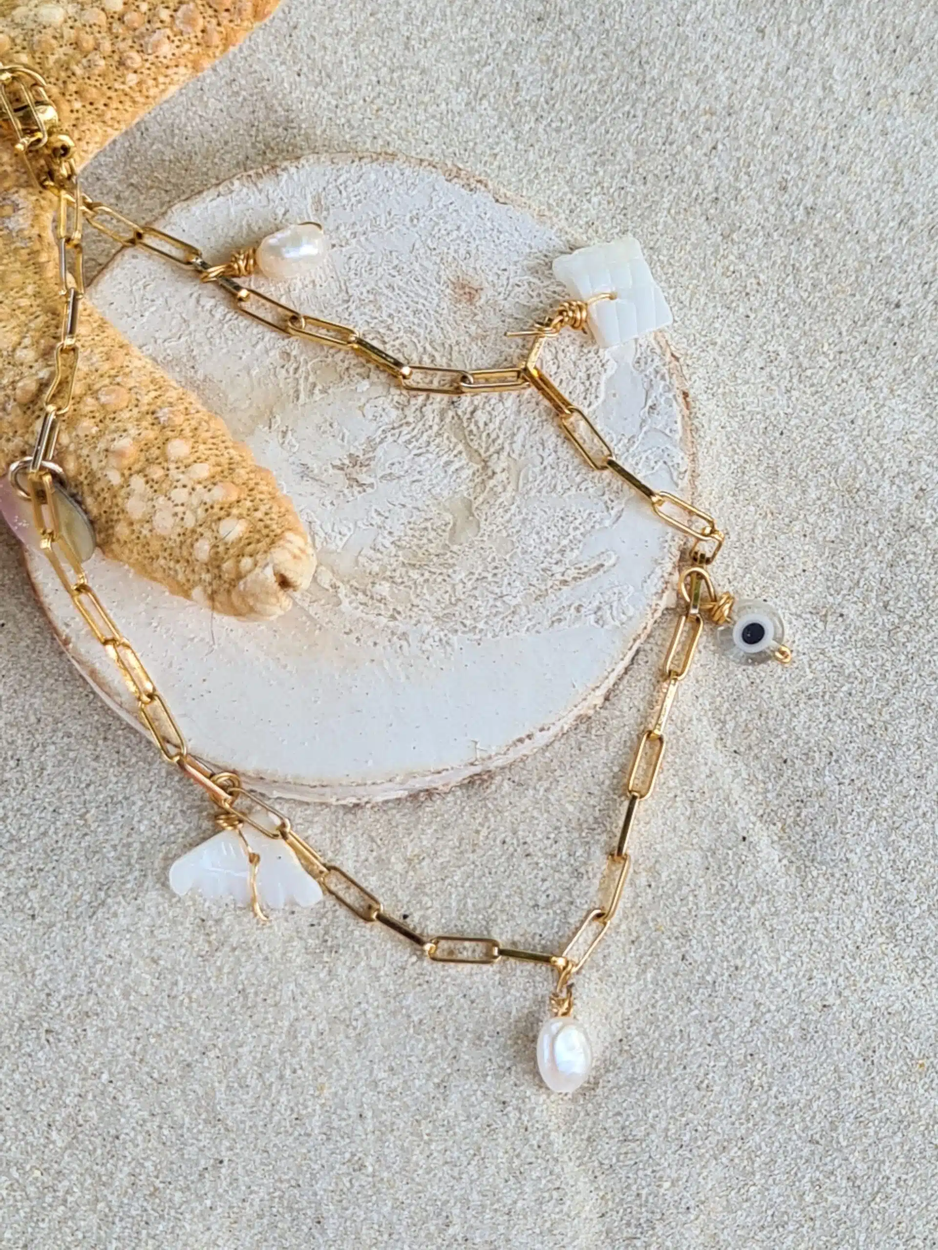 Chaine plaqué or 3 microns,  coquillage en nacre, longueur 23cm réglable.