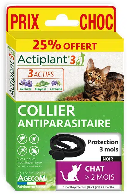 Le collier antiparasitaire Actiplant’3 a été spécialement formulé à partir de Géraniol, de Margosa et de Lavandin, des substances actives issues du monde végétal et reconnues pour leurs propriétés répulsives. La combinaison de ces 3 actifs associés dans une même formule crée un véritable booster végétal et permet une action renforcée sur les parasites.