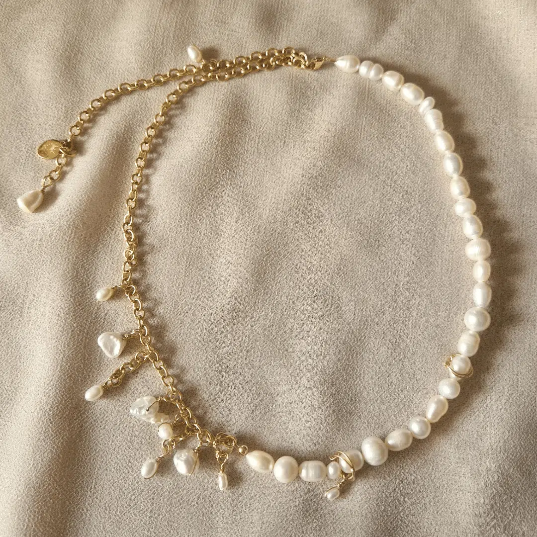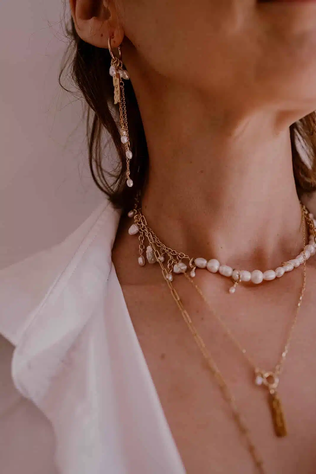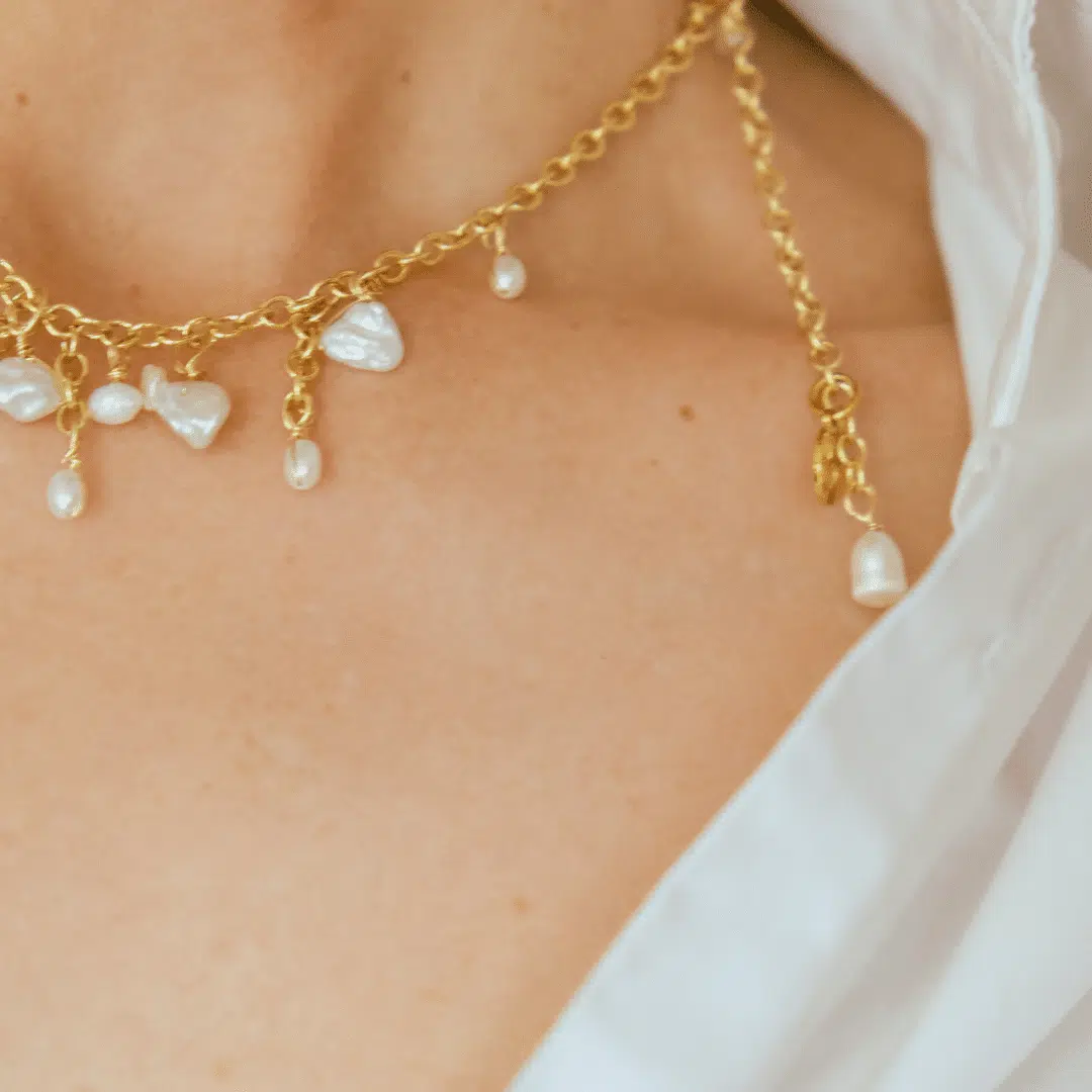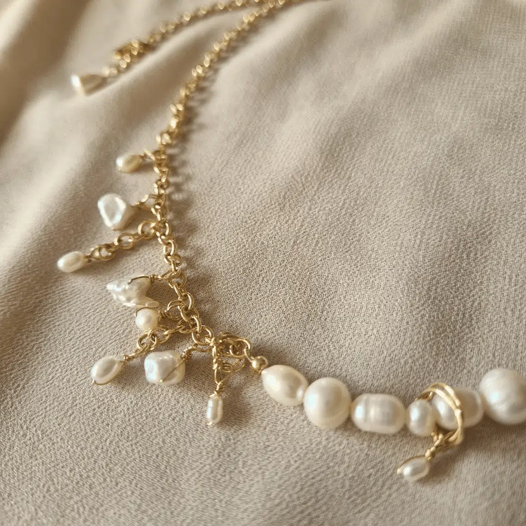 Composition : chaine doré à l’or fin, quartz, perles d’eau douce et coquillages