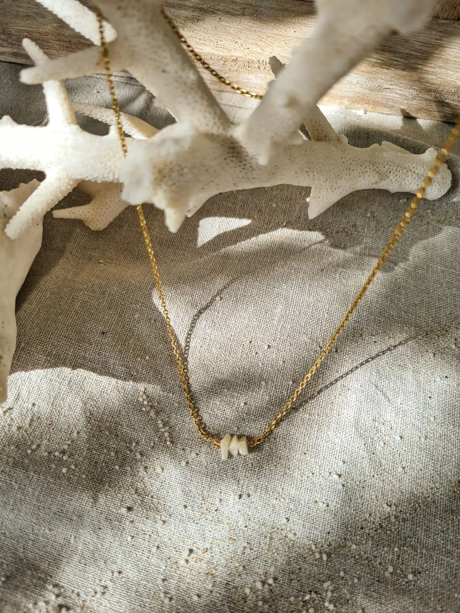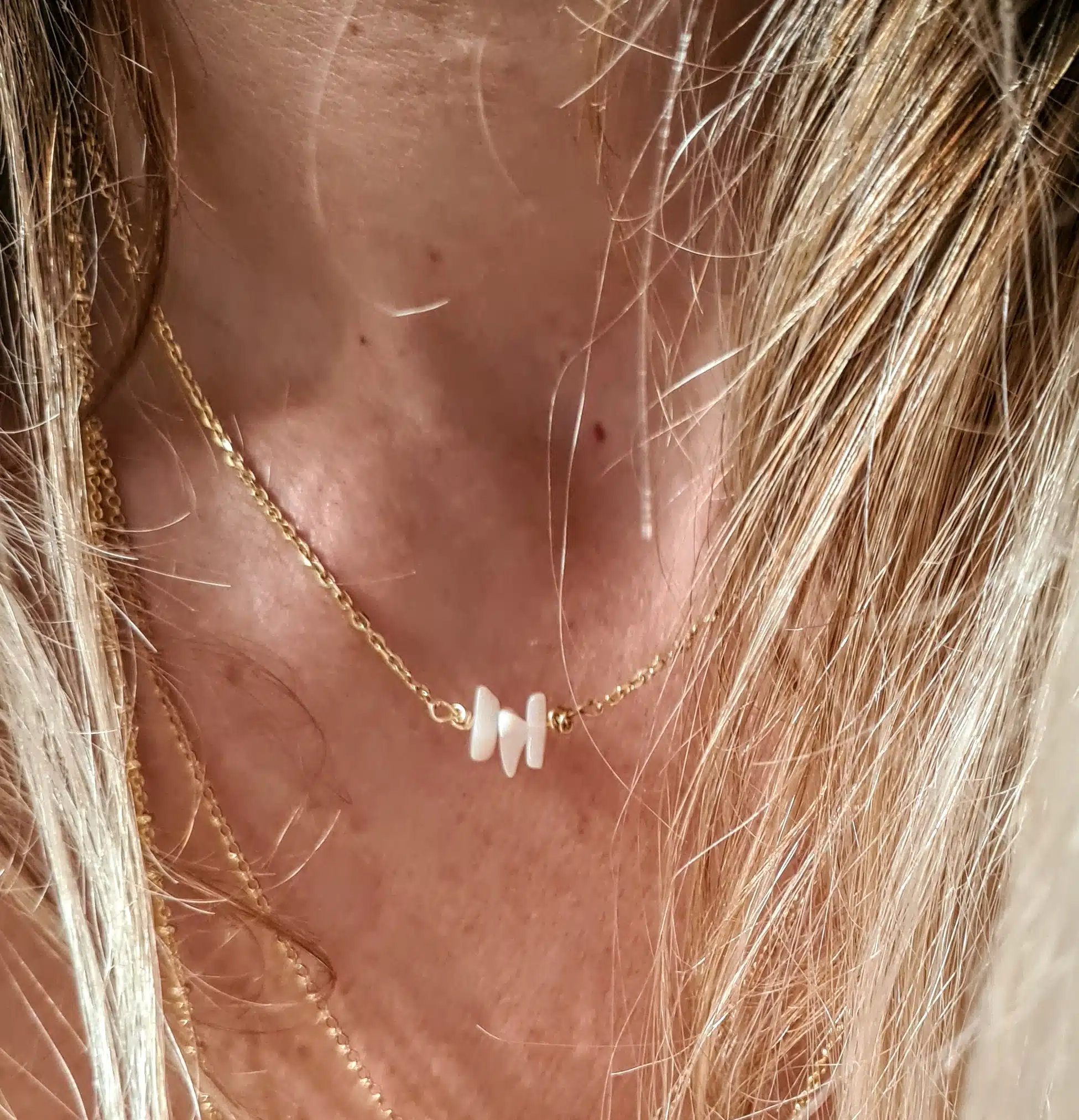 Le tour de cou “White”, un intemporel à porter en accumulation, une longueur idéale pour le marier à tous les autres intemporels de “La Plagette”. J’ai voulu mettre en avant ces petits “Chips” de nacre que je trouve si jolis.