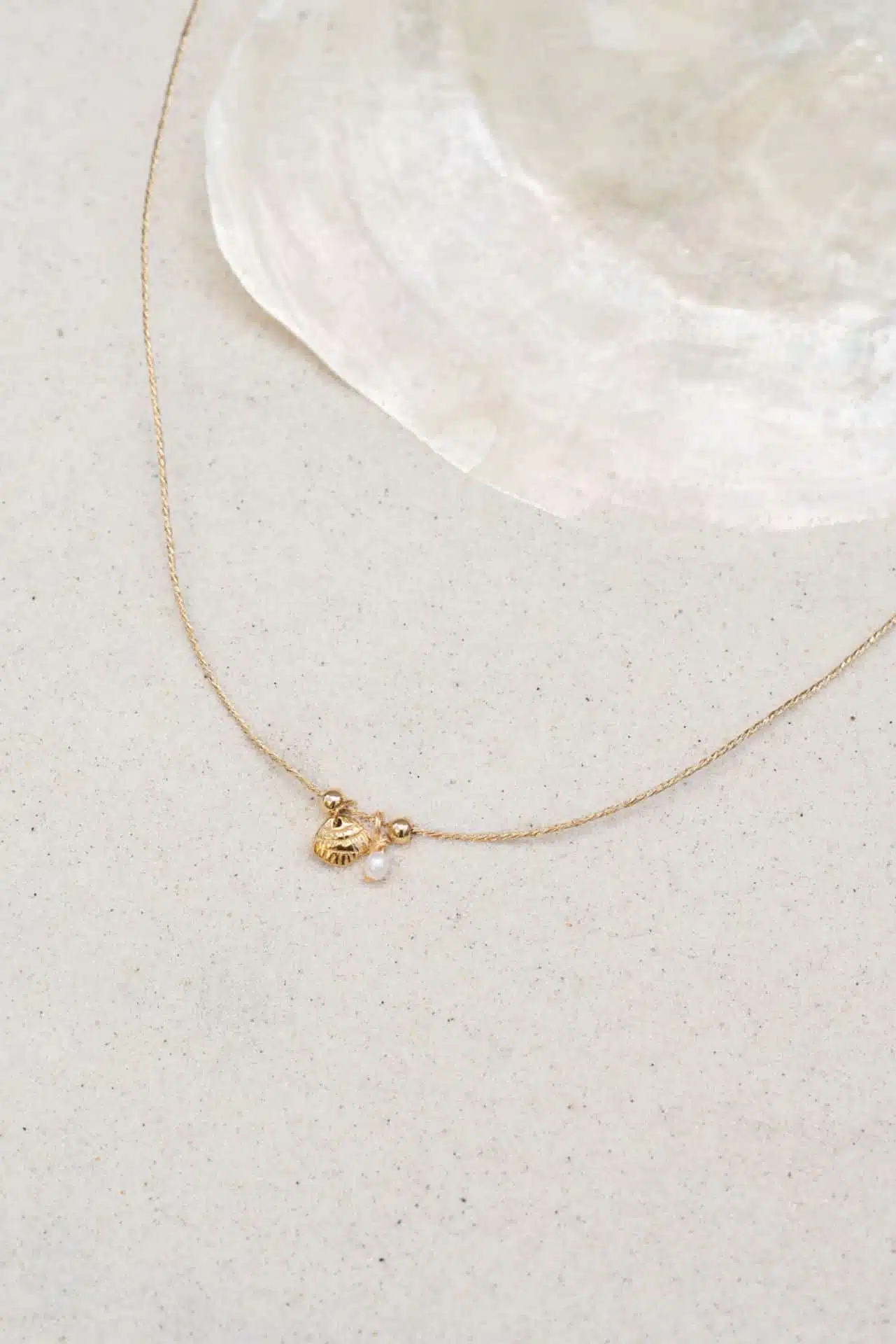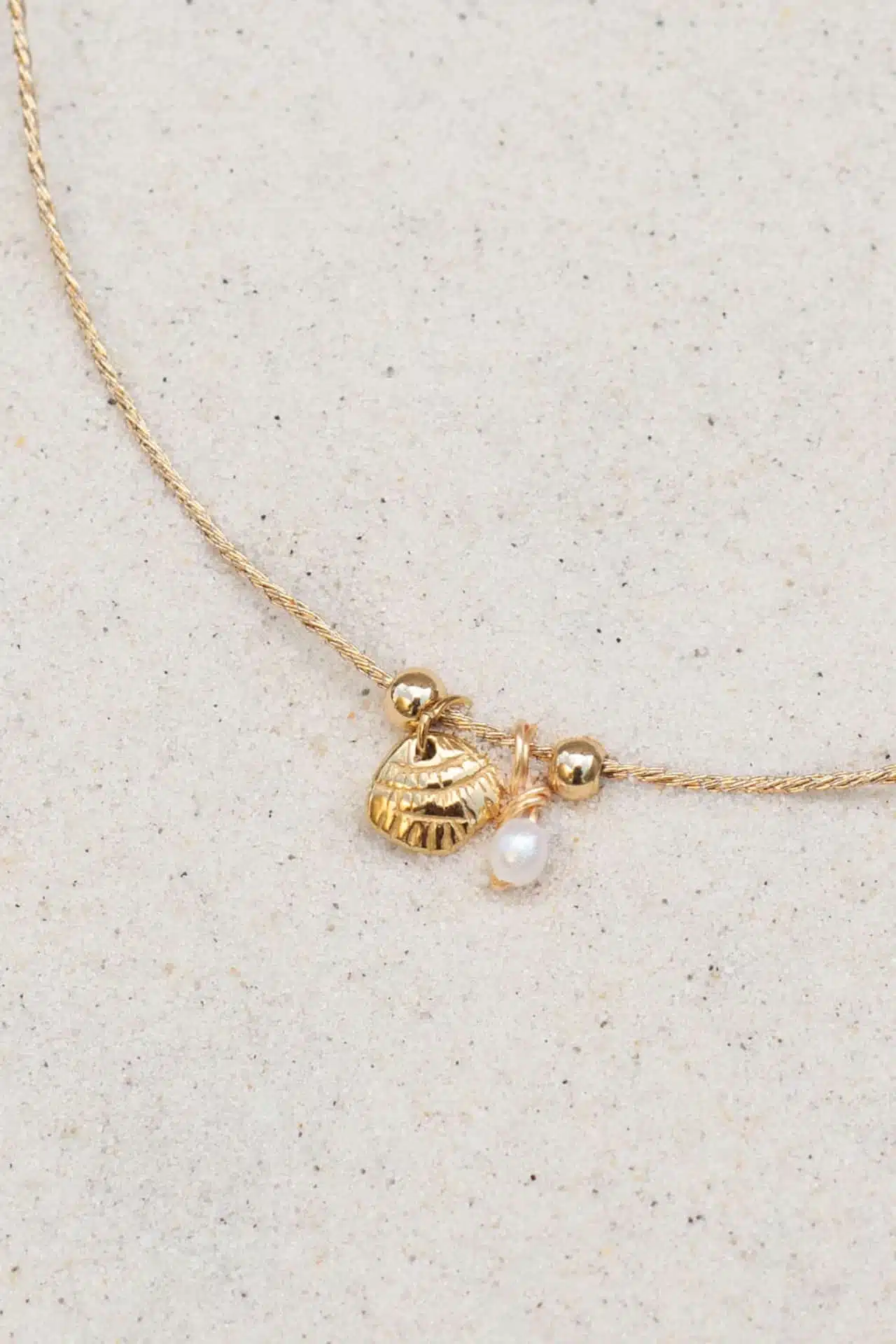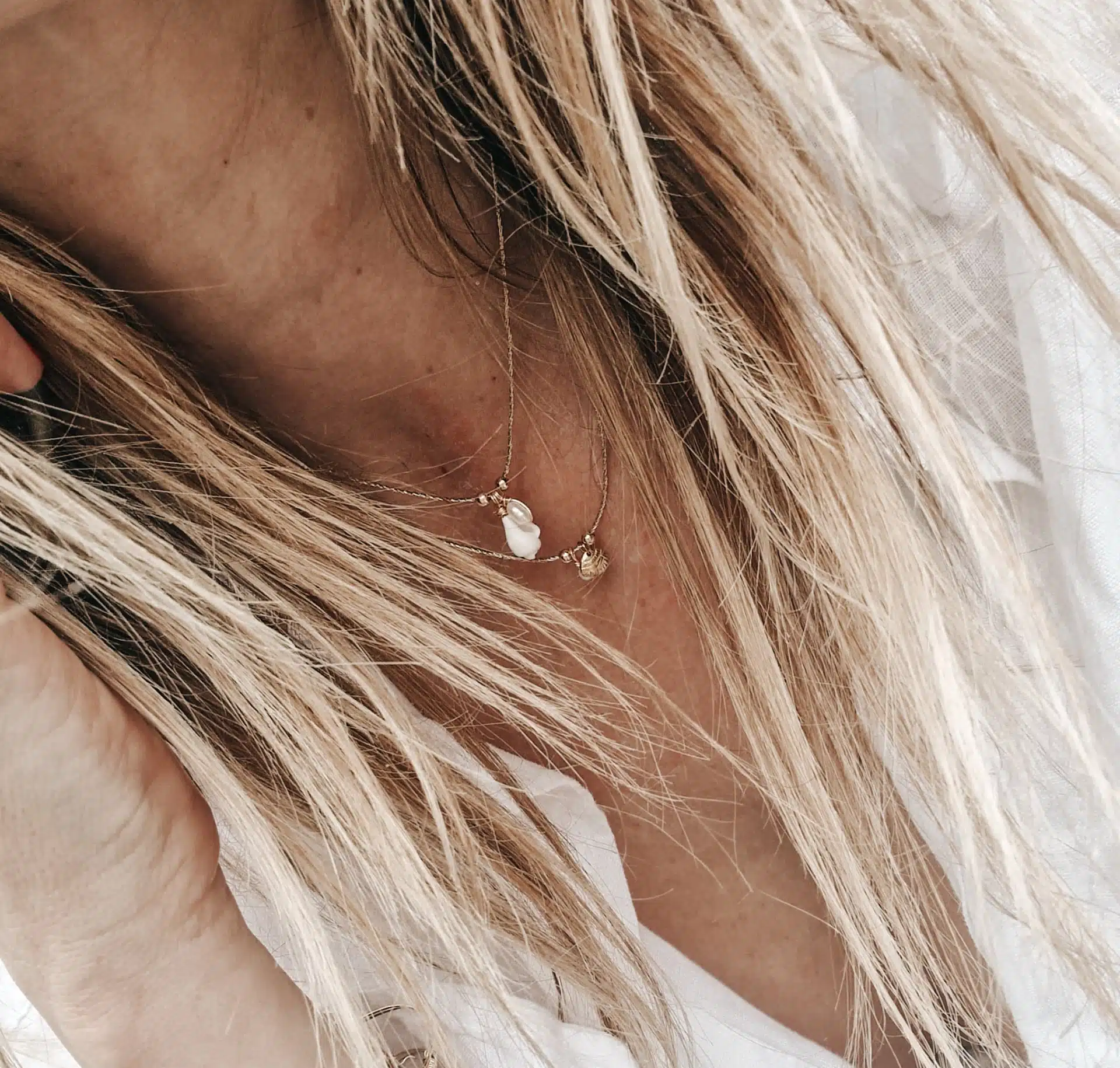 Composition : Gold filled, cordon métallisé, perles d’eau douce et breloque coquillage en plaqué or.