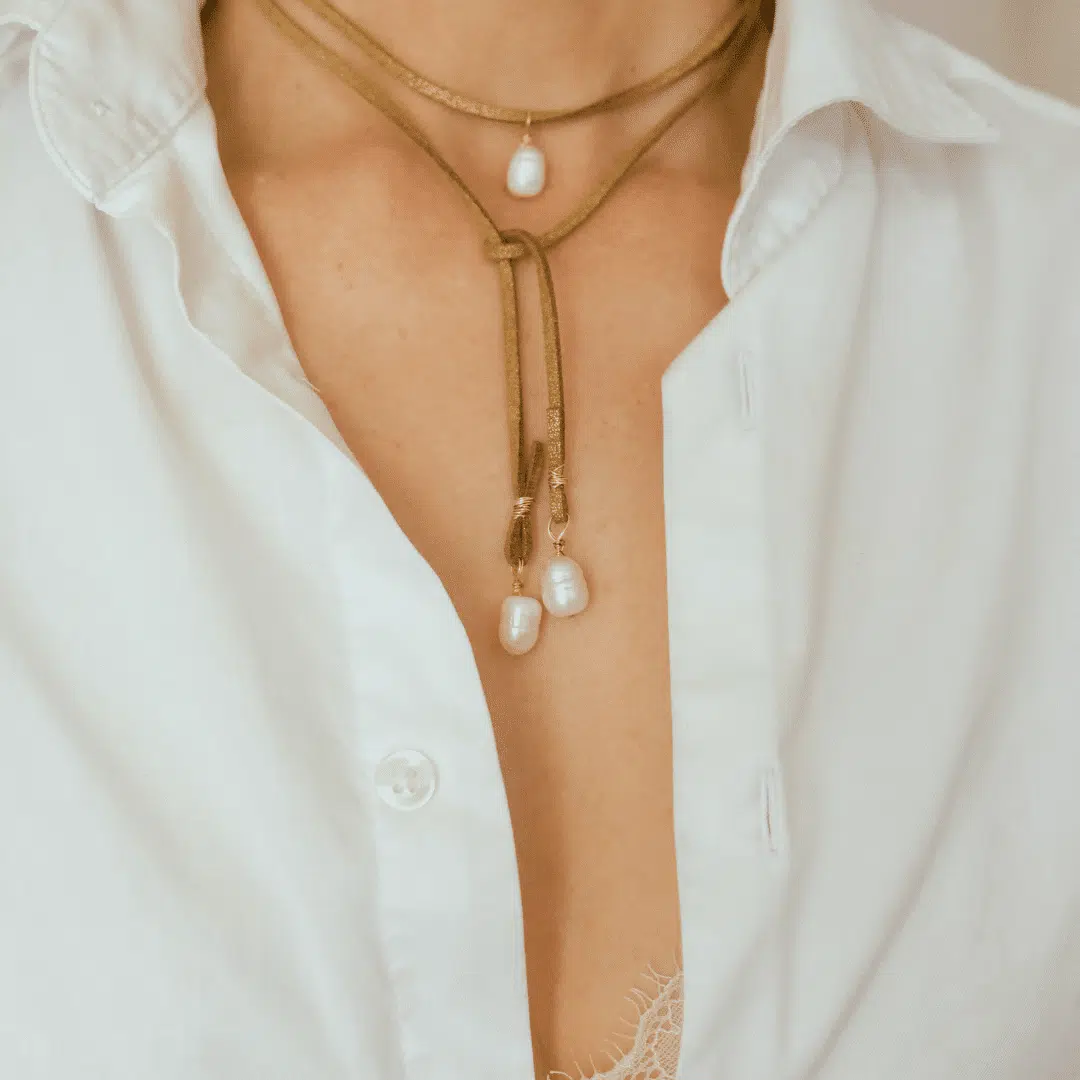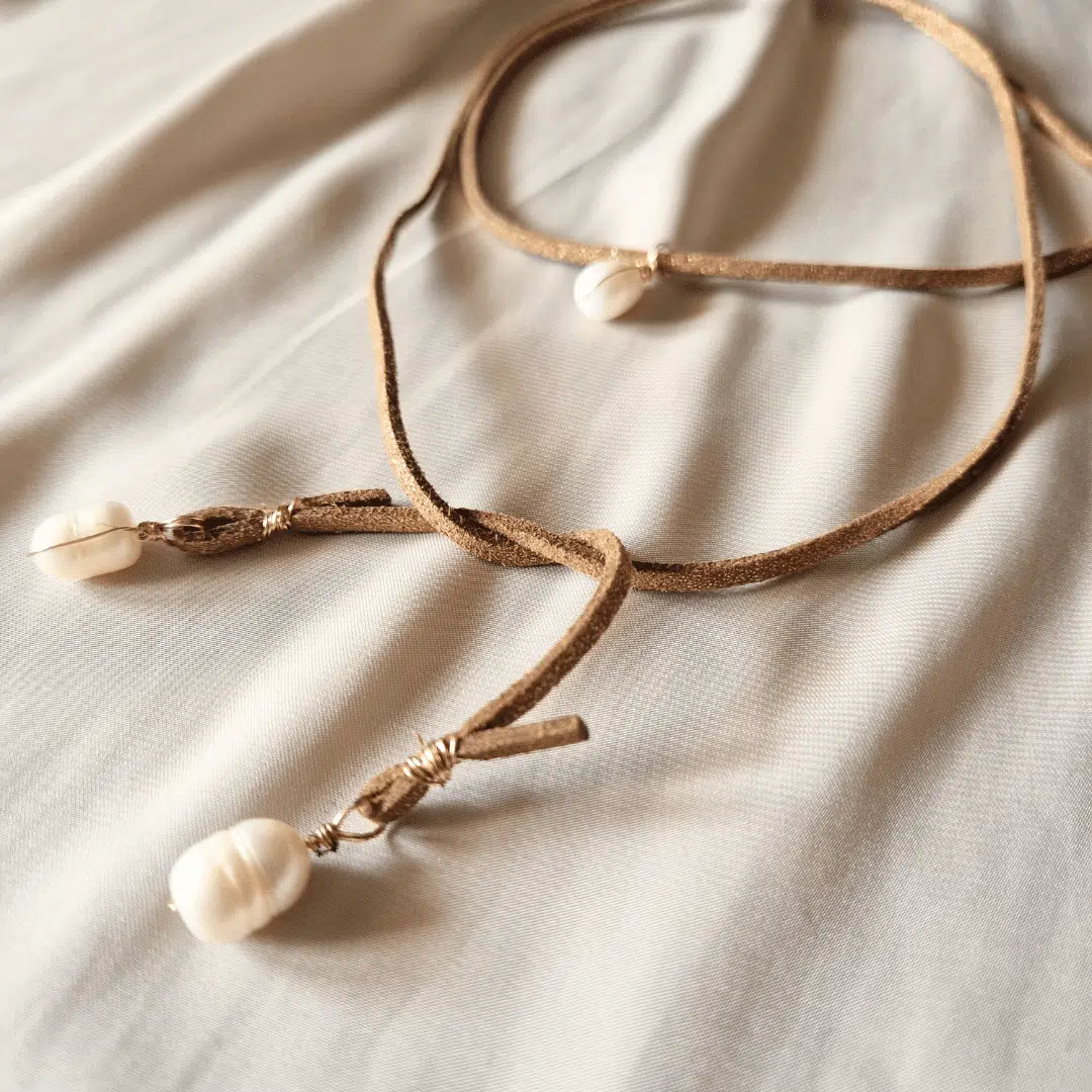 Cuir pailletté, longueur 80cm, réglable , nacre et fil plaqué or à nouer.