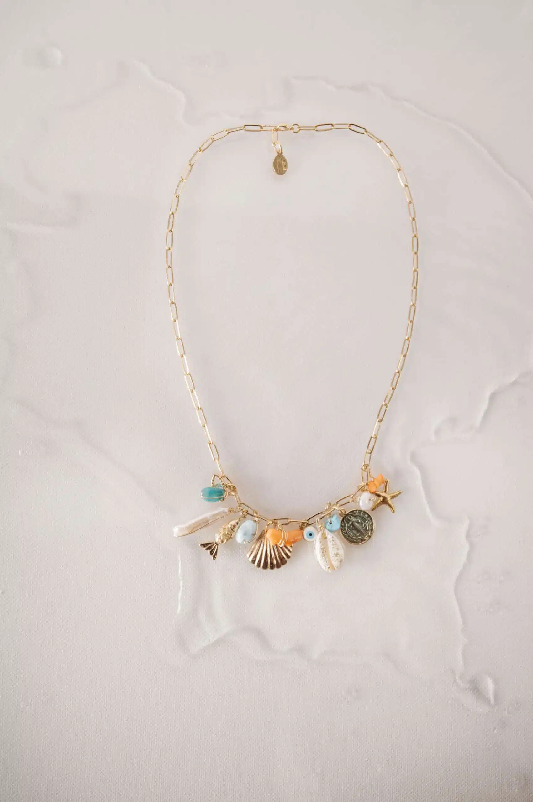 Nacre, plaqué or, coquillages , long de 45 cm réglable.
