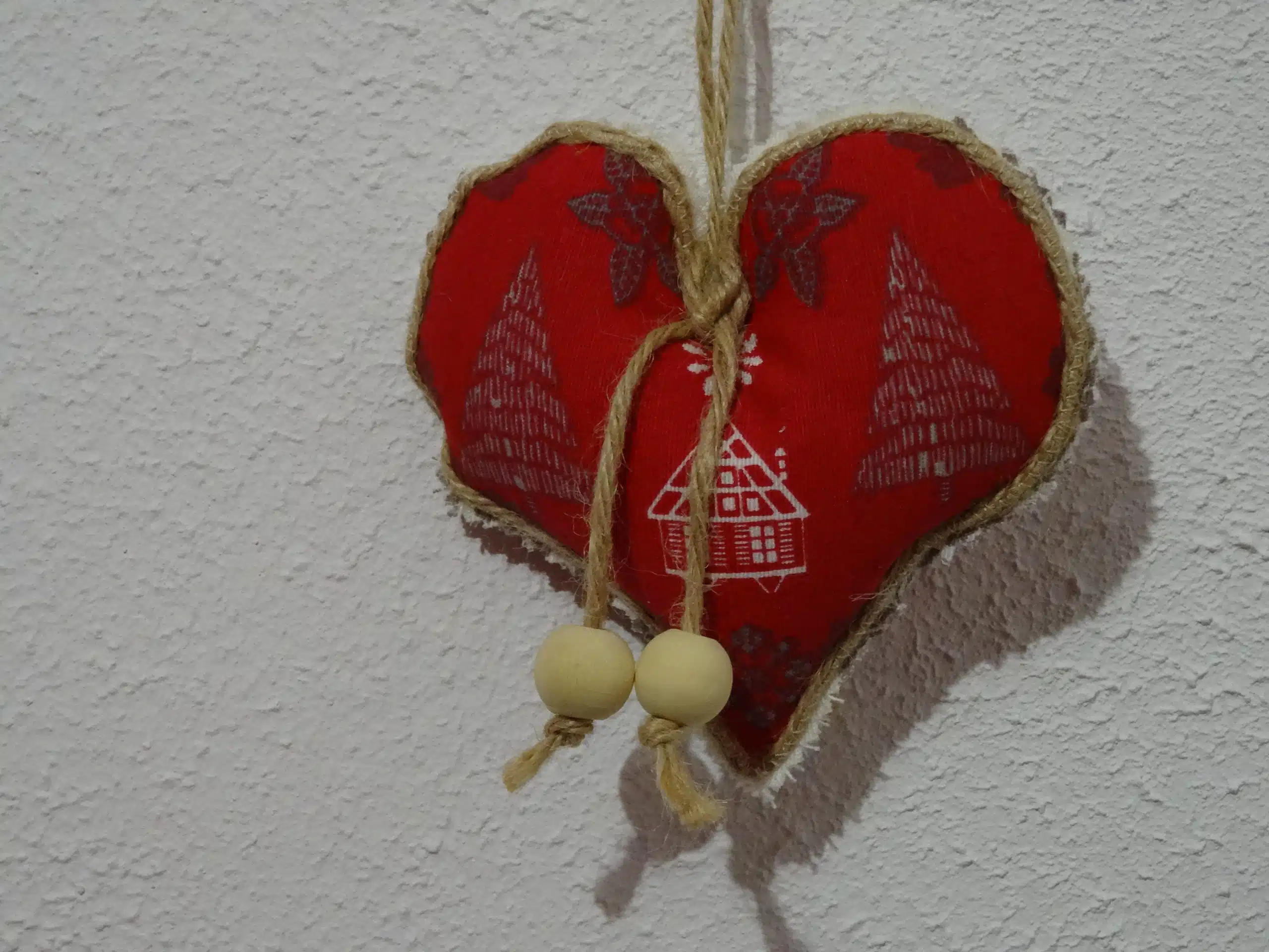 Cet élégant cœur en tissu d’un rouge profond d’un côté, il met en scène deux sapins altiers flanquant une petite maison, une représentation chaleureuse et nostalgique. De l’autre côté, toujours baigné dans cette teinte rouge passionnée, deux charmantes petites maisons émergent, symbolisant peut-être des souvenirs ou des rêves de doux foyers. Deux perles en bois sont judicieusement ajoutées, apportant une touche naturelle et rustique. Sans marque apparente, cette création d’environ 12 cm évoque l’authenticité, le soin, et la singularité.