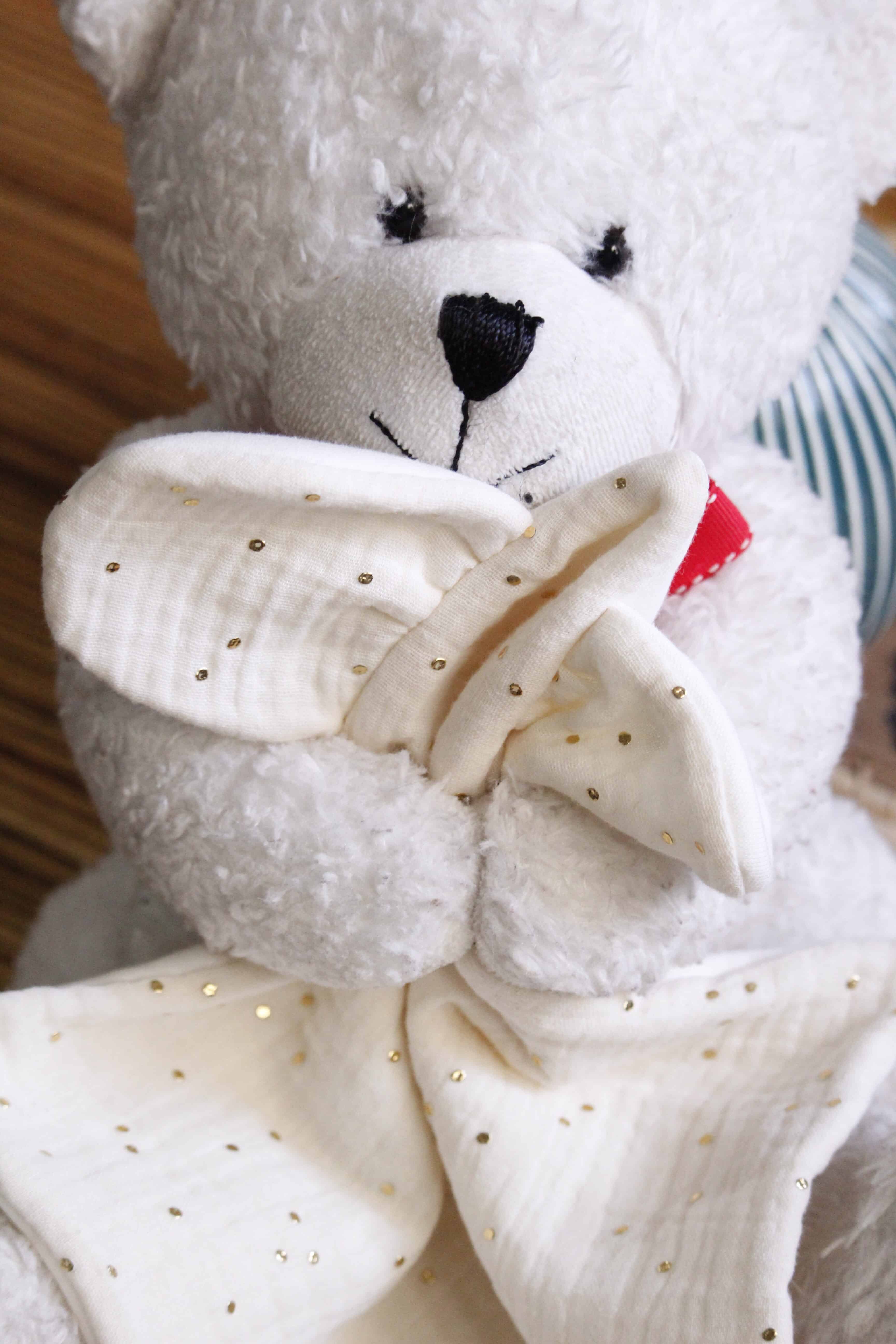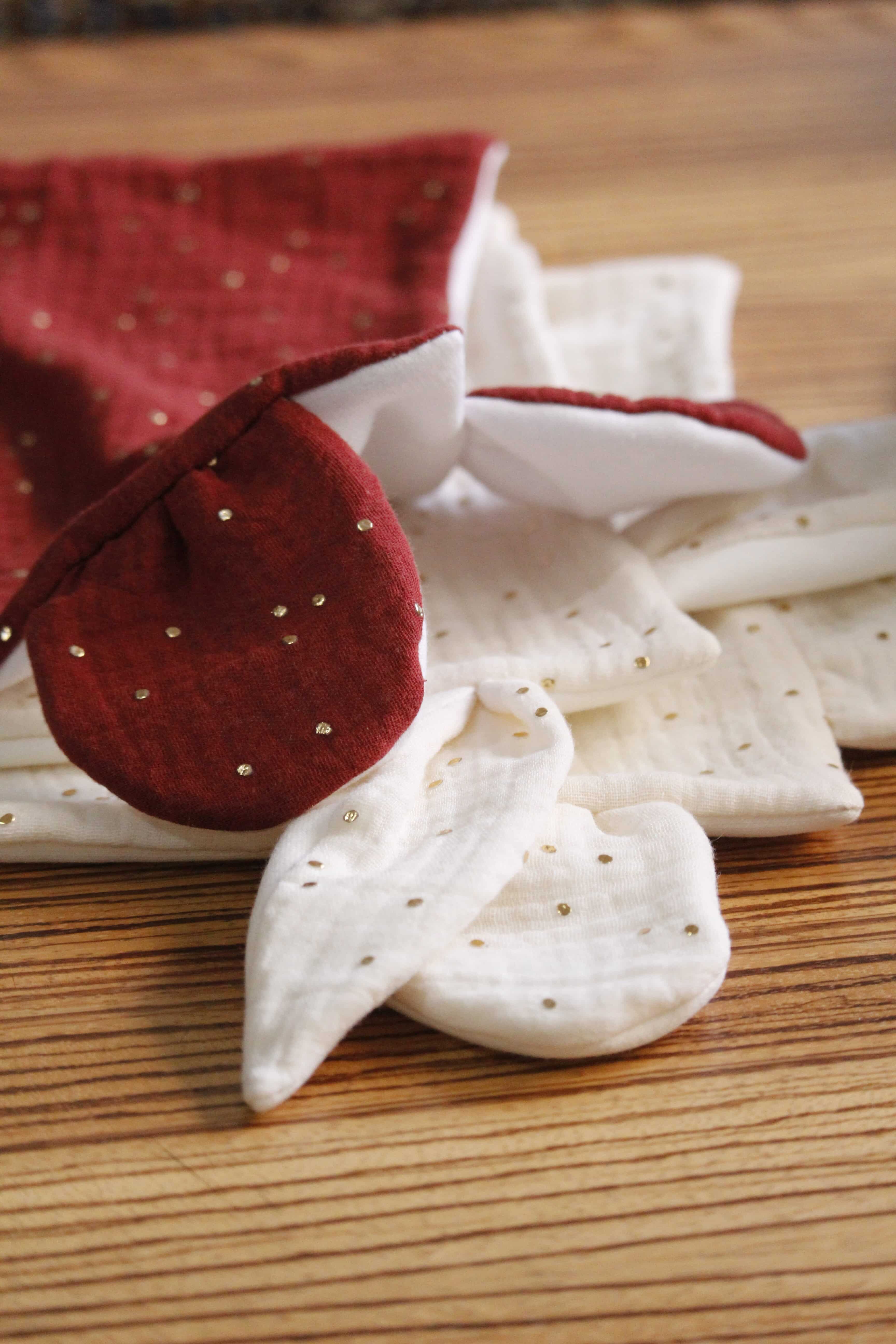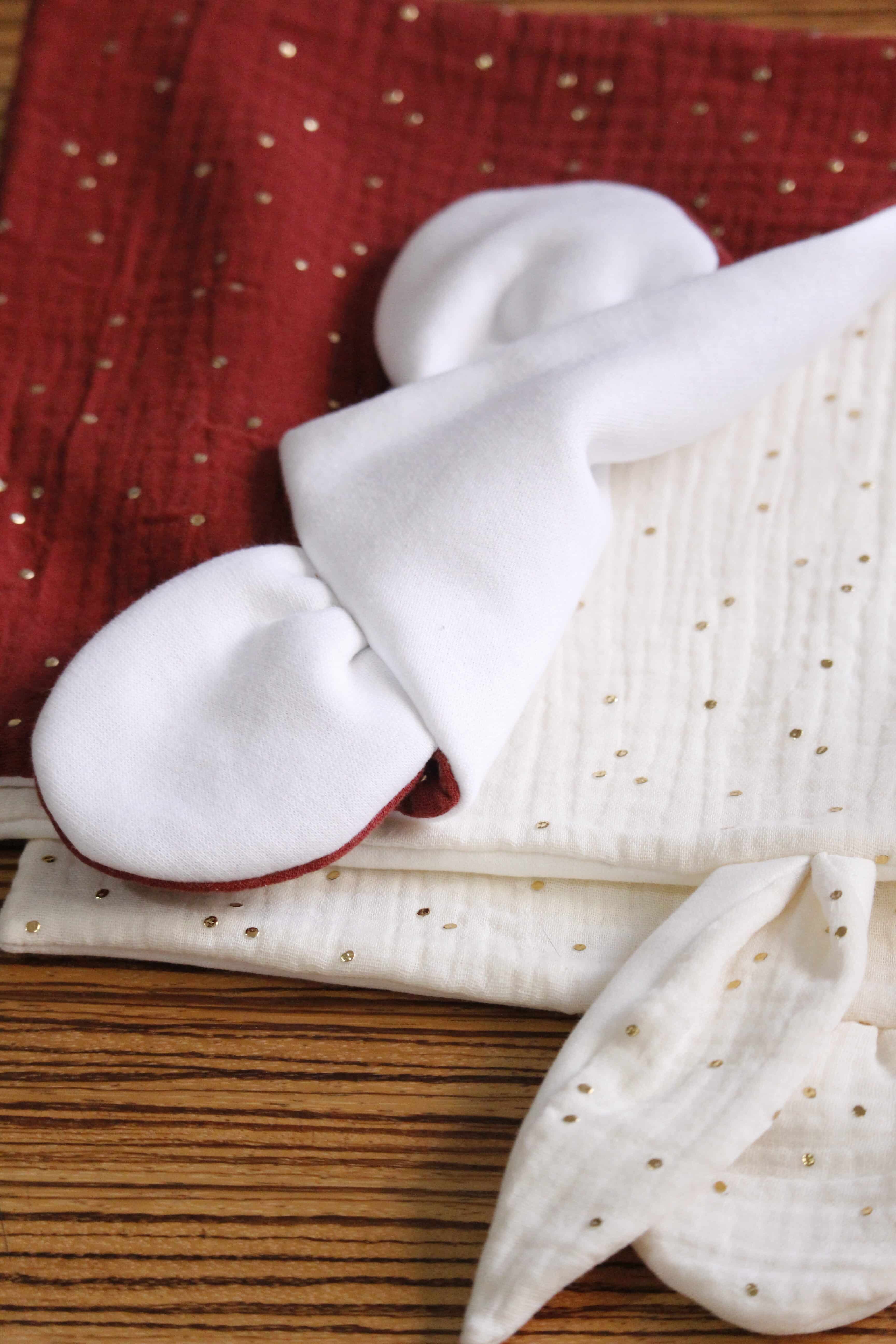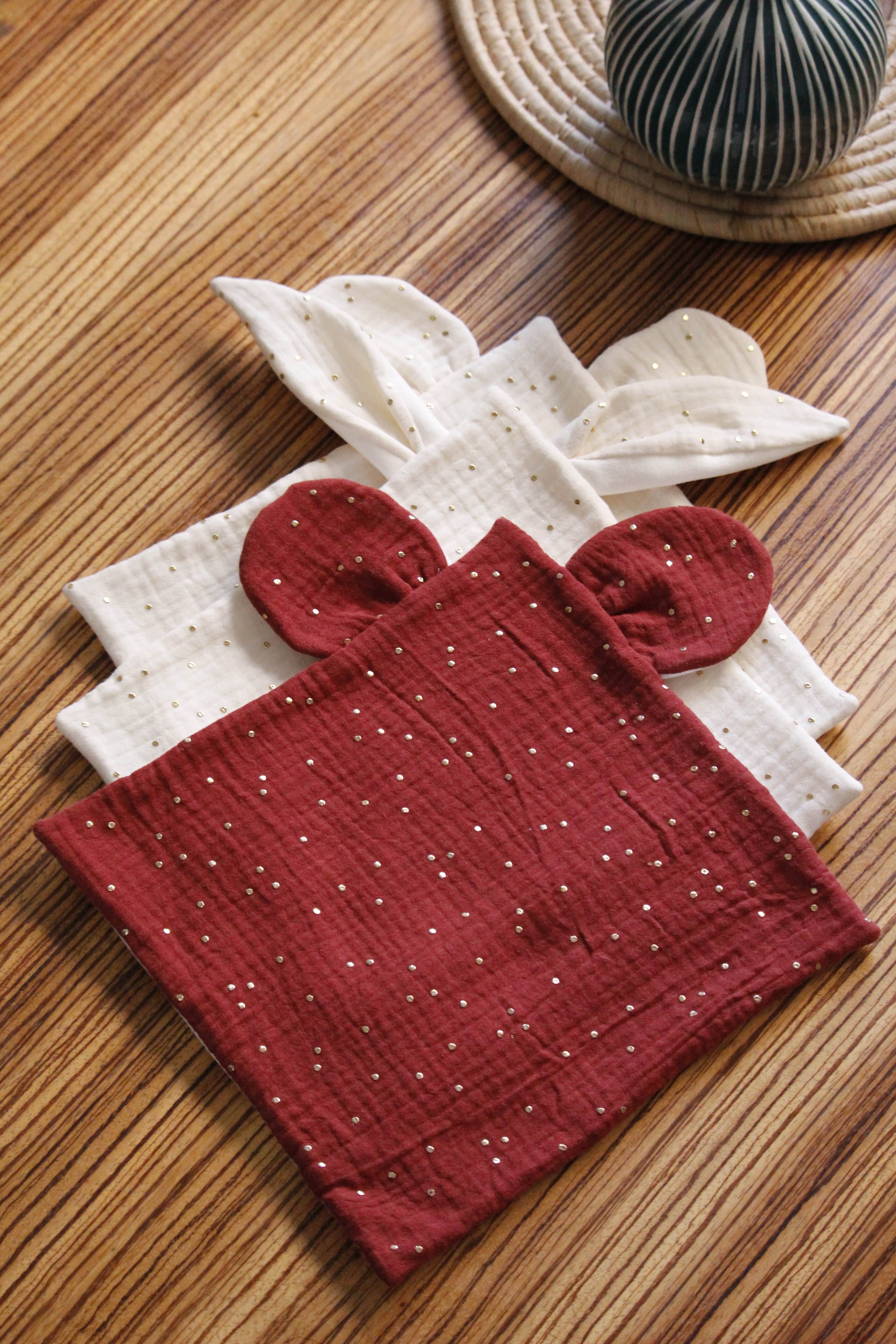 Les modèles lapin et souris, aux teintes écru et rouge rehaussées de pois dorés, offrent une esthétique douce et chaleureuse, parfaitement adaptée à l’univers de la naissance. Sans accroche tétine, ce doudou est volontairement épuré, favorisant le contact direct avec le tissu.