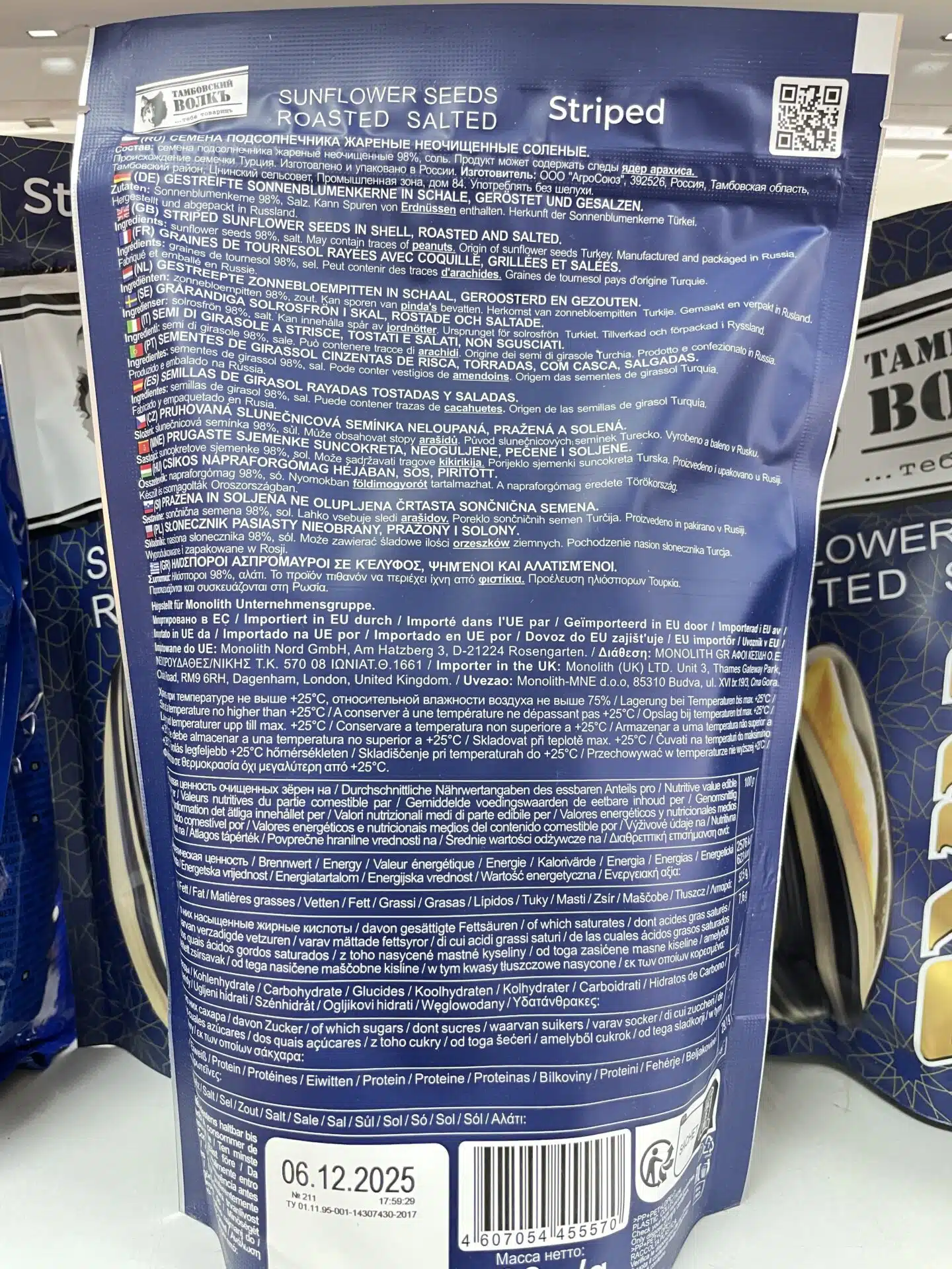 Les graines de tournesol rayées de la marque Tambovskiy Volk sont soigneusement sélectionnées, grillées avec leur coque pour préserver leur croquant naturel, puis subtilement salées pour rehausser leur goût. Présentées dans un sachet pratique de 500 g, elles sont idéales pour l’apéritif, une pause gourmande ou un grignotage sain. Produites selon des standards de qualité élevés, elles constituent une collation riche en fibres, protéines végétales et acides gras essentiels.