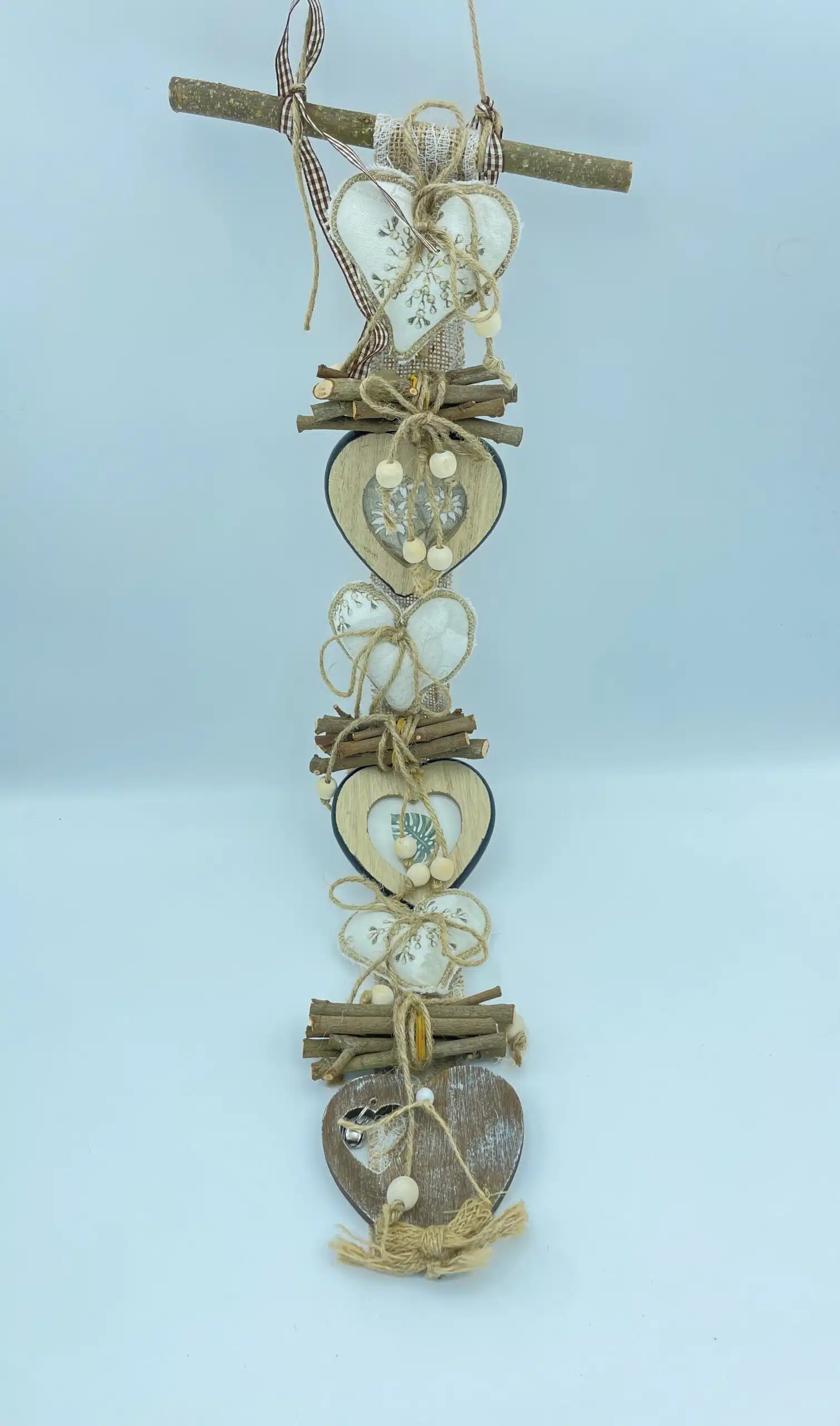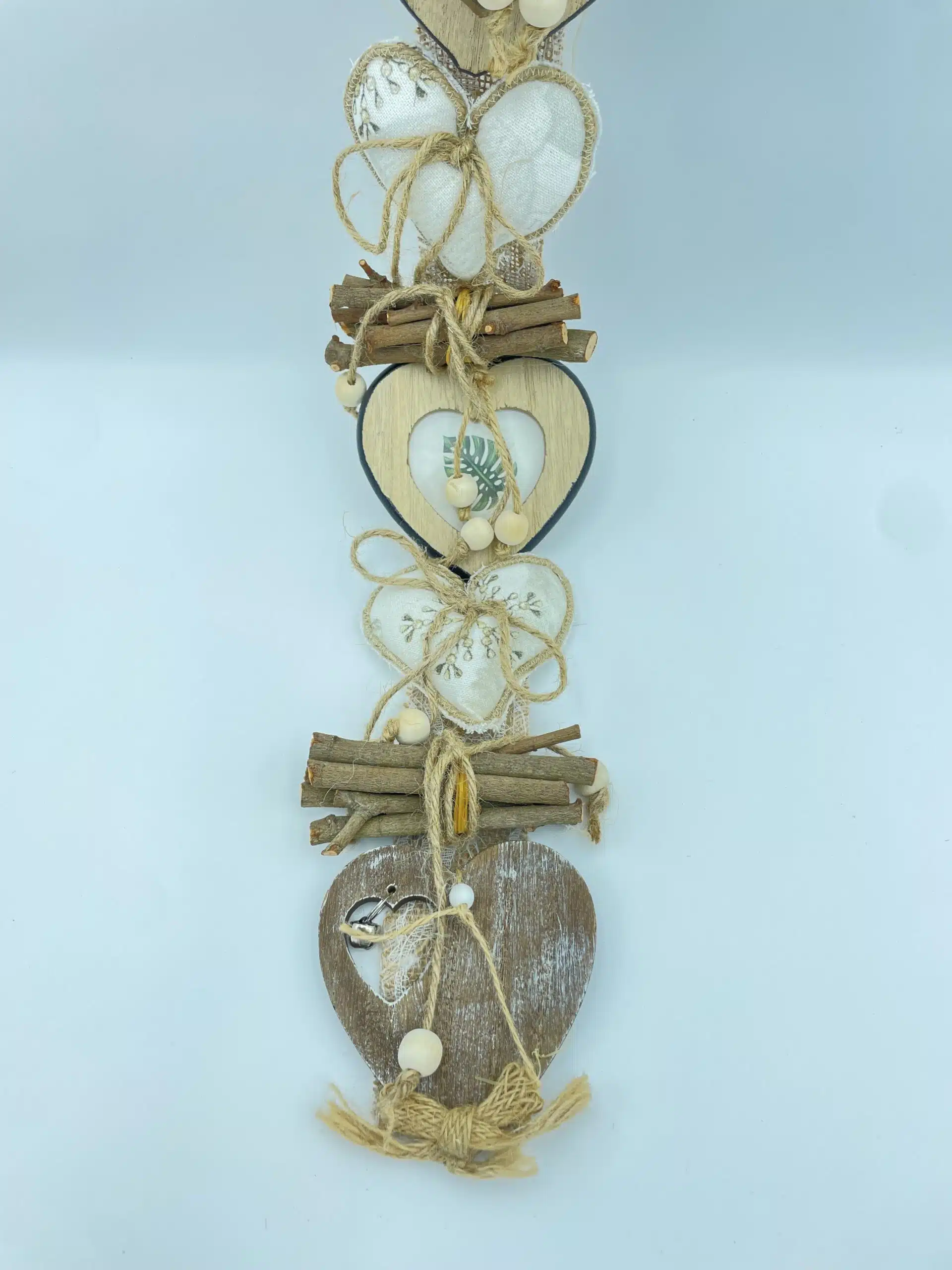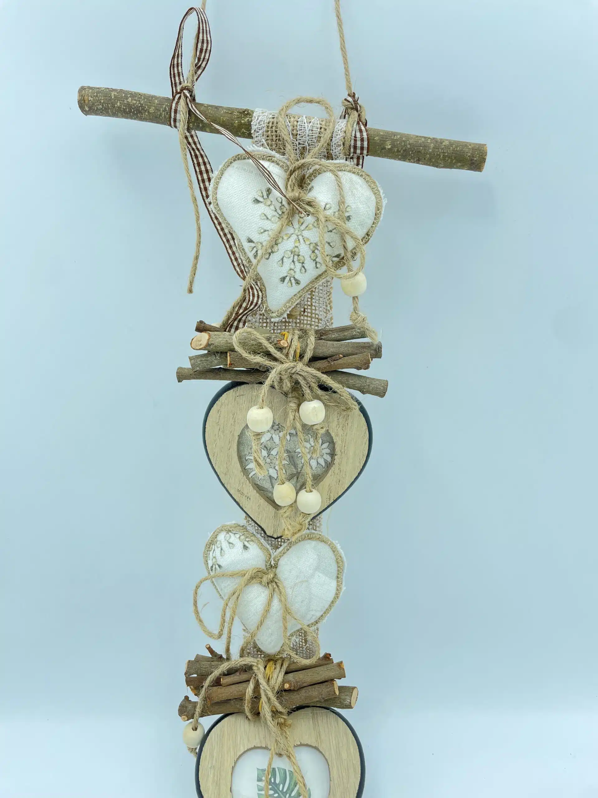 Découvrez cette guirlande décorative artisanale, subtilement élaborée à partir de bois et de tissu, et s’étendant sur une longueur d’environ 90 cm. Trois cœurs en tissu délicat, de couleur blanche avec des contours beiges, sont soigneusement ornés de deux perles en bois, conférant à l’ensemble une touche d’élégance rustique. S’y ajoutent deux cœurs en bois, évoquant la robustesse et le charme naturel du matériau. Ces cœurs en bois sont délicatement accompagnés de trois petits lots de morceaux de bois attachés, ajoutant texture et dimension à la guirlande.