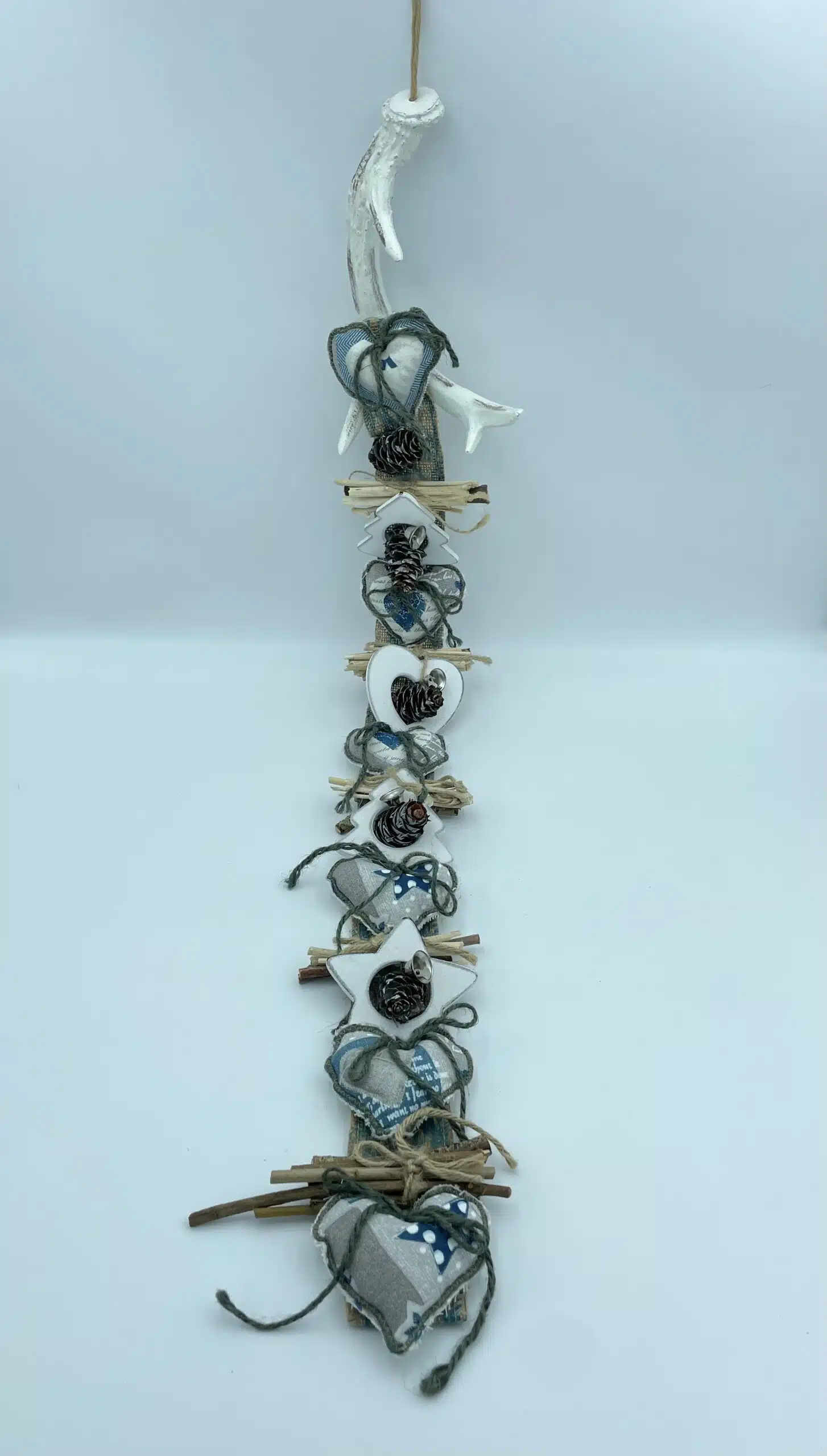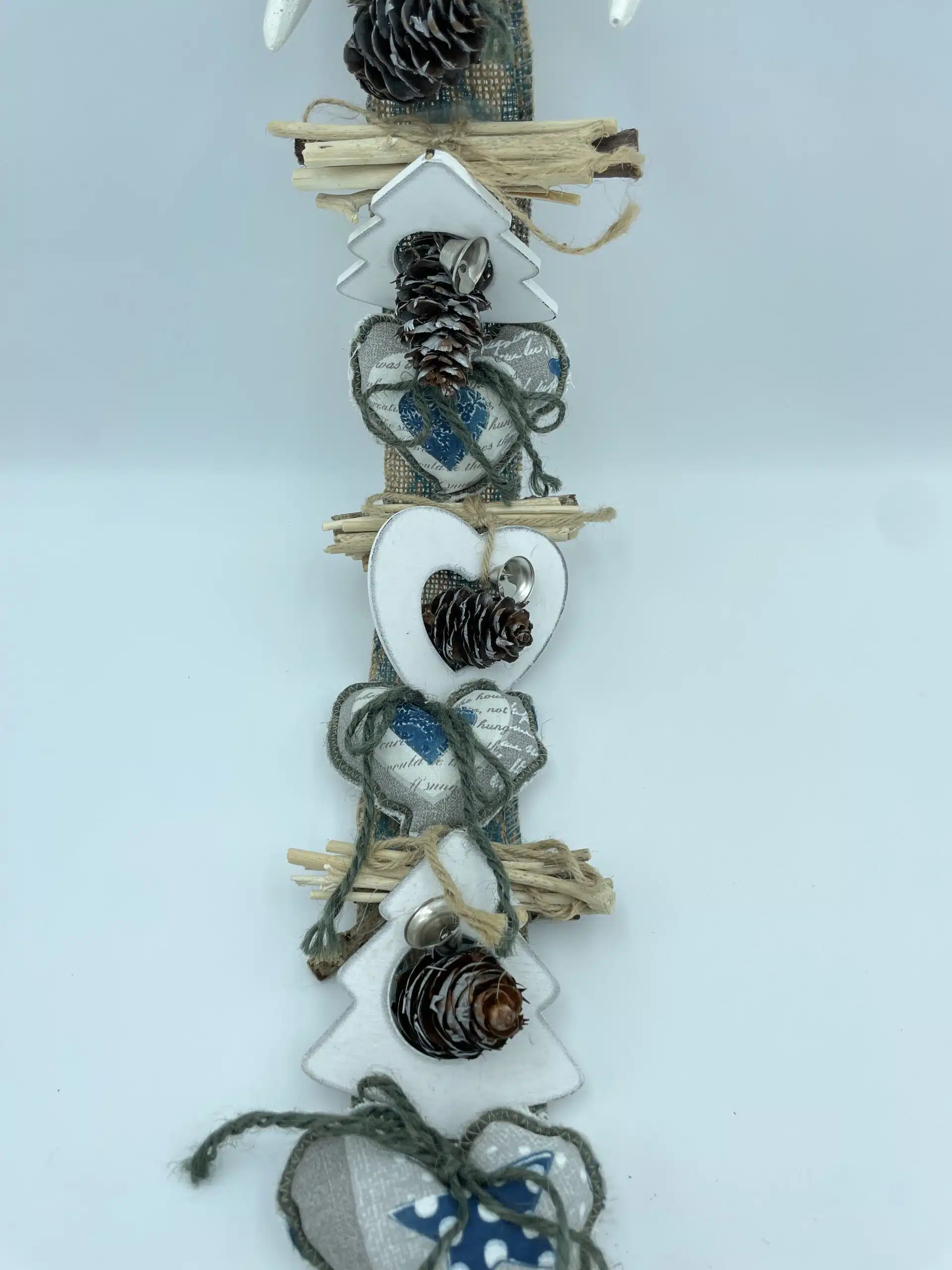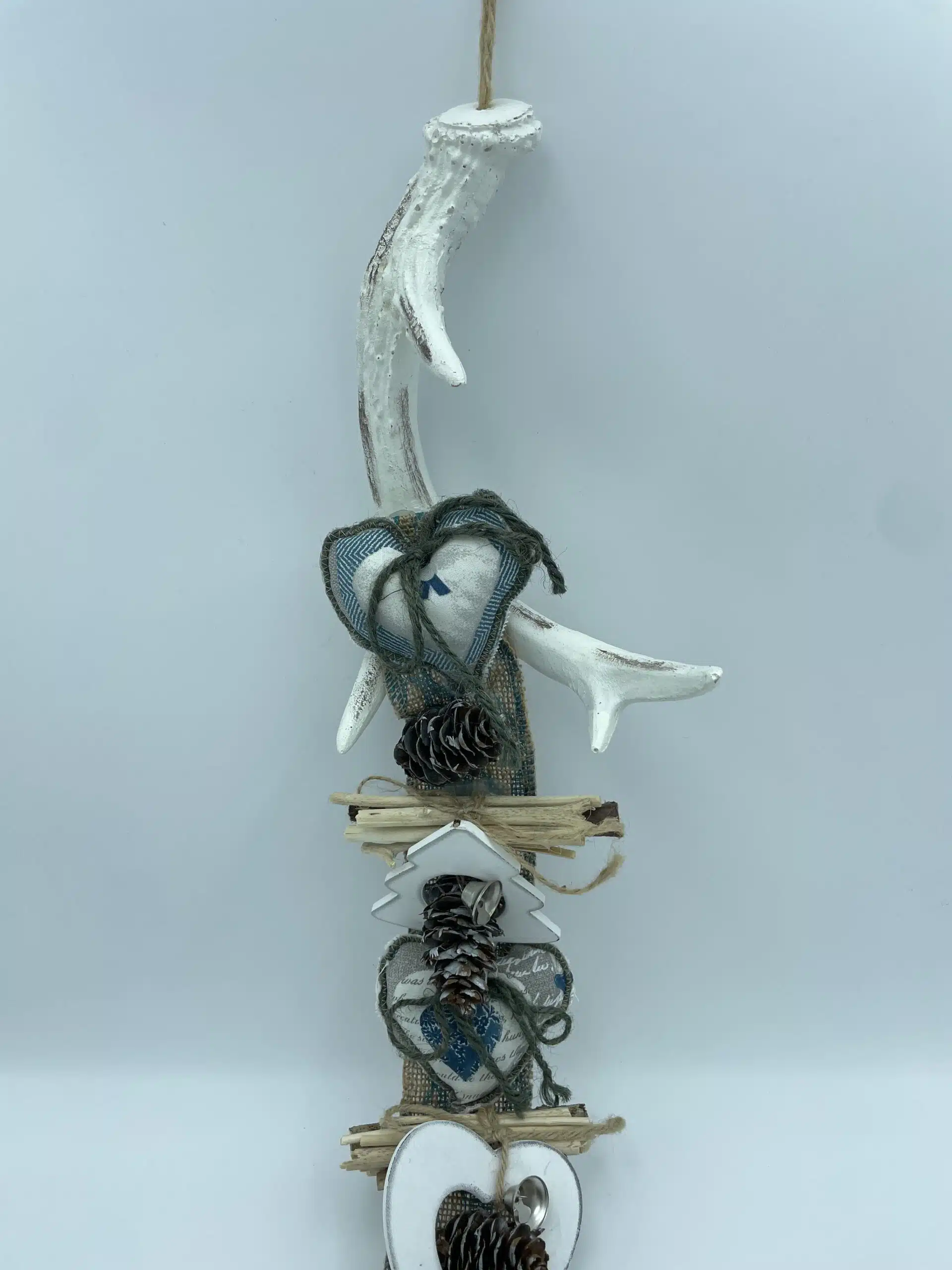 La blancheur pure des éléments en bois, qu’il s’agisse des sapins paisibles, du cœur romantique ou de l’étoile lumineuse, contraste parfaitement avec les teintes plus sombres des cœurs en tissu. La pièce maîtresse de cette création est sans aucun doute la corne de cerf en bois, peinte en blanc. Elle sert de support à cette guirlande, symbolisant la majesté et l’élégance de la nature.