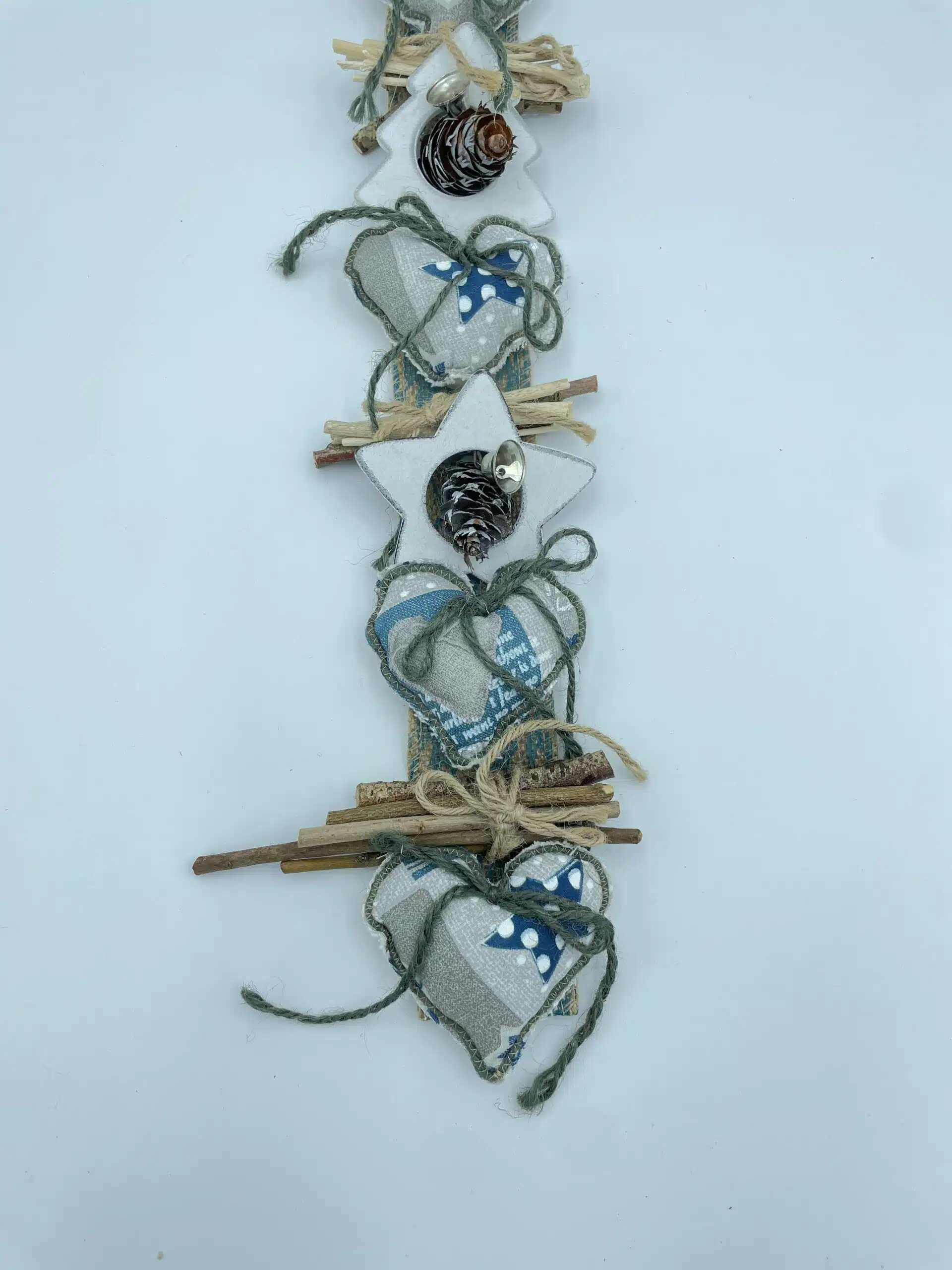 Six cœurs en tissu aux nuances douces de bleu, marron, gris et blanc dansent délicatement le long de la guirlande, chacun racontant sa propre histoire de couleur. Accompagnant ces cœurs, cinq lots de petits morceaux de bois sont joliment attachés avec de la ficelle, ajoutant une texture rustique à l’ensemble.