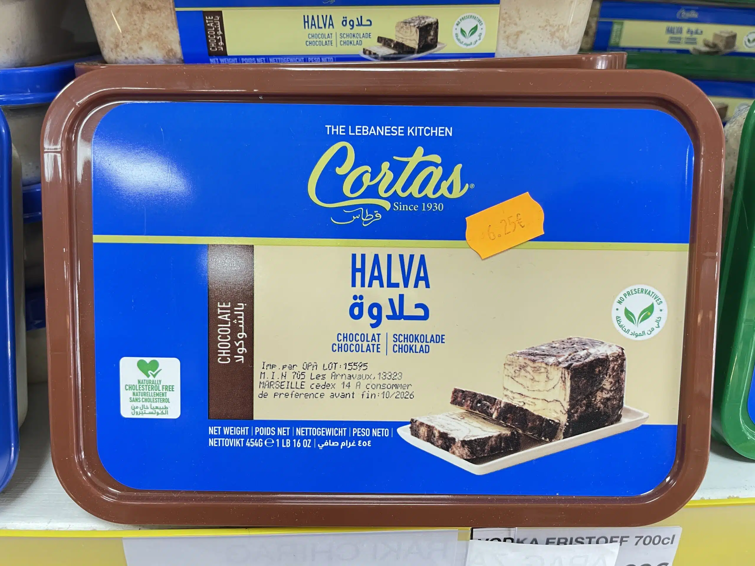 Plongez dans les saveurs orientales avec cette halva au chocolat de la marque Cortas. Fabriquée au Liban selon une recette traditionnelle, cette gourmandise associe la richesse du tahina (47,5 %) à la douceur du sucre (44 %) et au caractère du cacao maigre. Une texture fondante et marbrée qui séduit les amateurs de douceurs orientales.