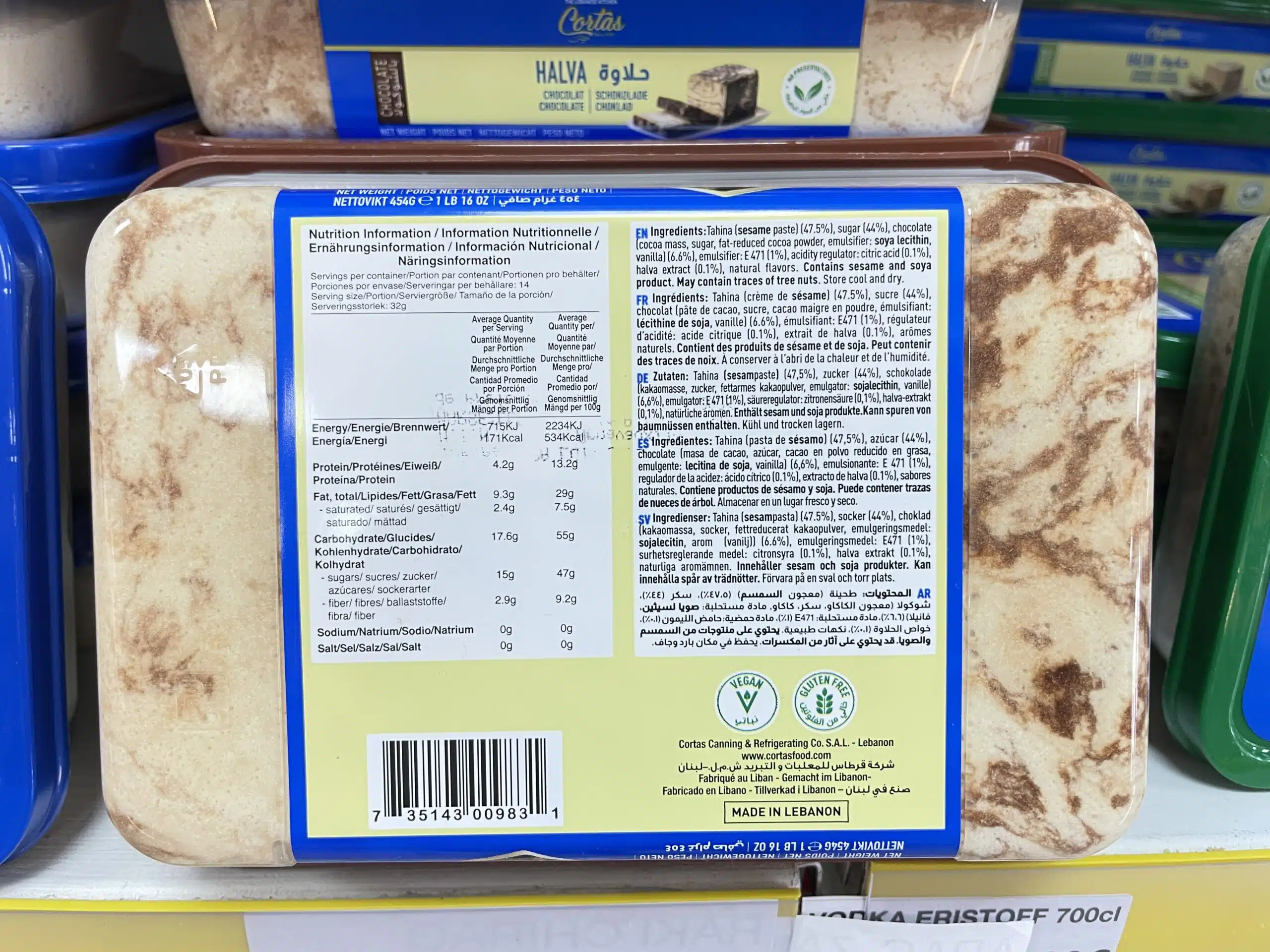Tahina (pâte de sésame) 47,5 %, sucre 44 %, chocolat (cacao maigre, sucre, poudre de cacao partiellement dégraissée), émulsifiants : lécithine de soja, E471, E492, régulateur d’acidité : acide citrique, arôme naturel, extrait de halva, extrait de vanille.