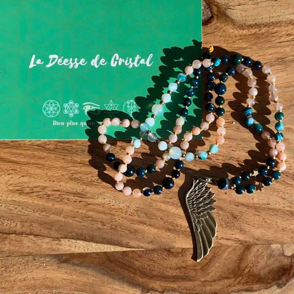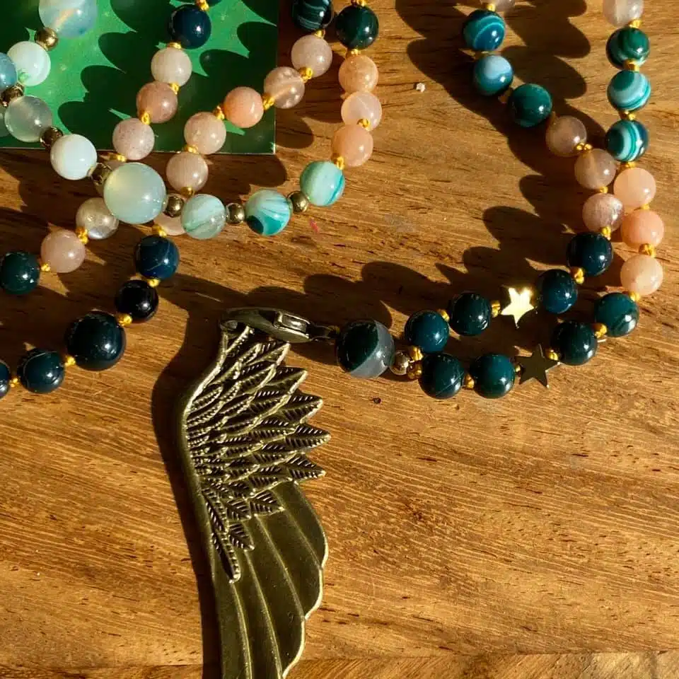 Une délicate breloque en forme d’aile d’ange ajoute une dimension divine à ce mala, amplifiant son charme et sa puissance spirituelle.