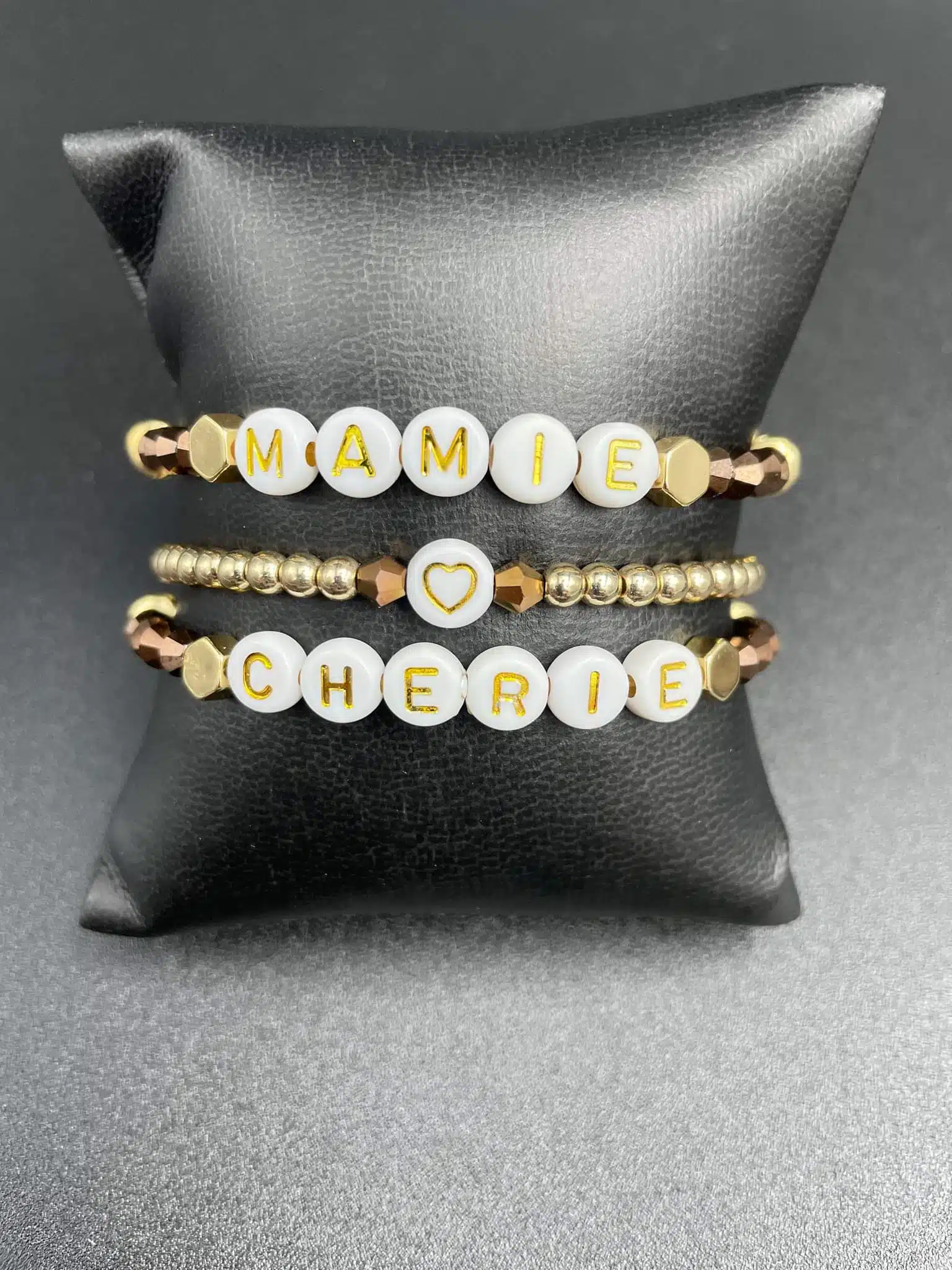 Offrez-vous un voyage élégant et sentimental avec ce lot de trois bracelets pour femme. Chaque bracelet est soigneusement conçu avec des perles marron rehaussées par des éclats dorés. L’un d’eux dévoile le mot “mamie” en délicates perles, une tendre dédicace à la personne exceptionnelle qu’est une grand-mère. Le second bracelet arbore un cœur symbolique, tandis que le troisième exprime l’affection avec le mot “chérie”. Un délicat pompon marron foncéajoute une touche finale de raffinement.