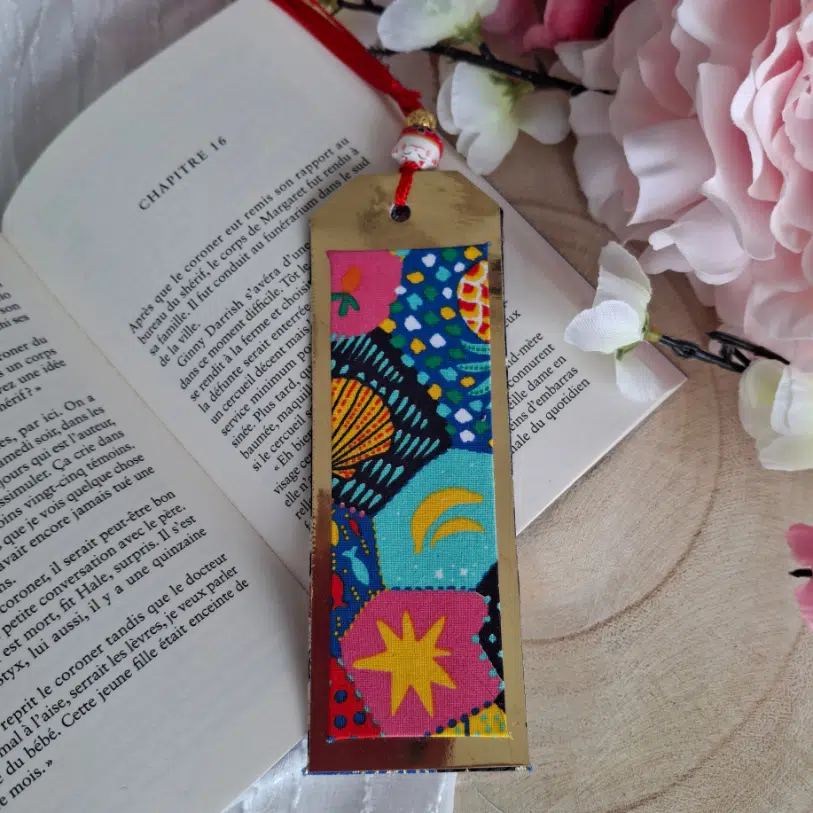 Devant : Marque page en papier miroir doré et insert en tissu japonais.