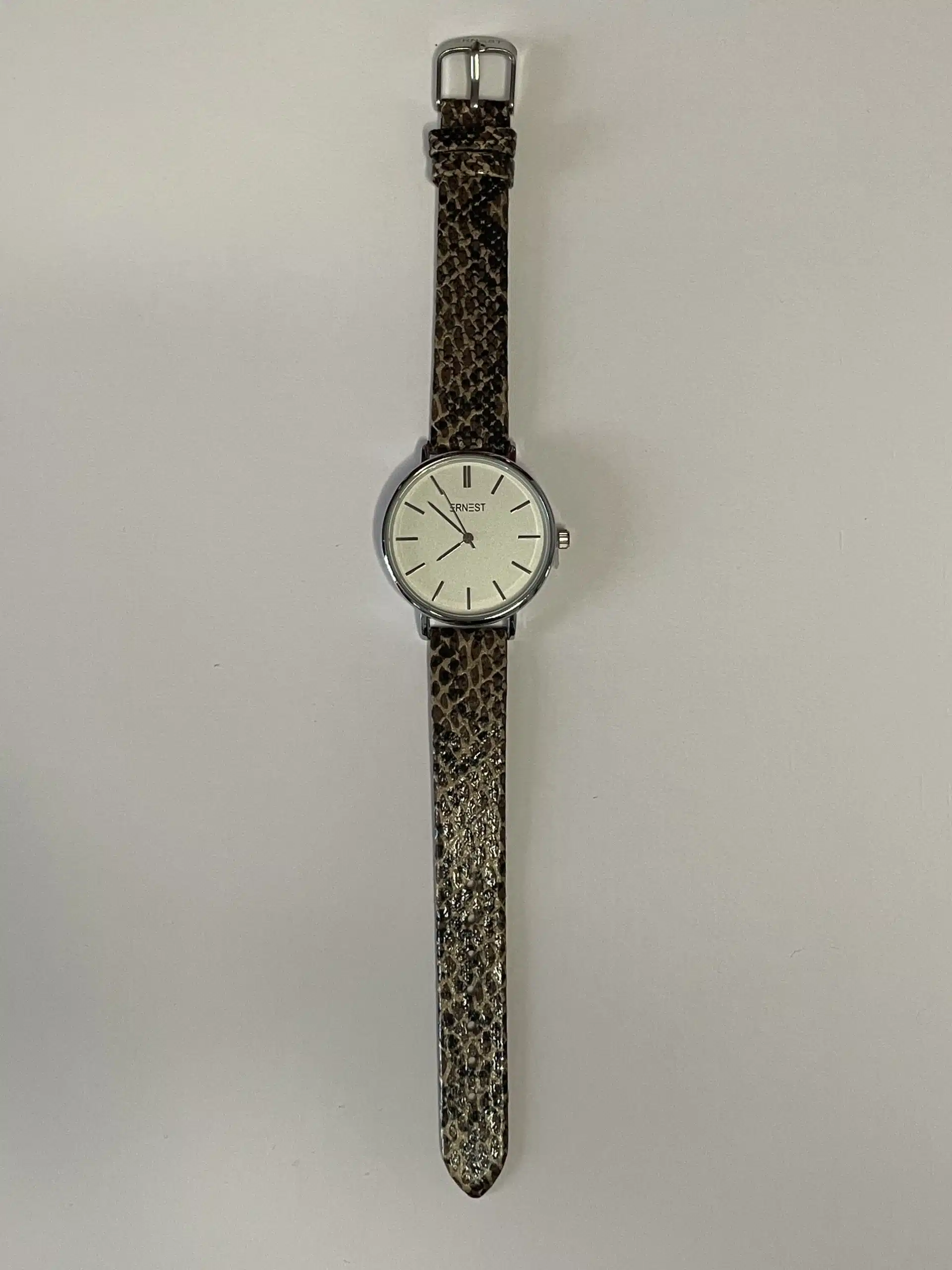Sublimez votre poignet avec cette montre neuve pour femme Ernest. Le boîtier rond, élégamment conçu en acier, mesure 35 mm de diamètre, offrant une présence discrète mais affirmée. Le bracelet en simili cuir arbore une finition crocodile, une touche de sophistication qui ne passera pas inaperçue. D’une largeur de 16 mm, le bracelet allie confort et style. La combinaison du design classique du boîtier rond et de la texture audacieuse du bracelet en fait un accessoire indispensable pour toute femme moderne. Produit neuf, exprimez votre sens du style avec la qualité et l’élégance d’Ernest.