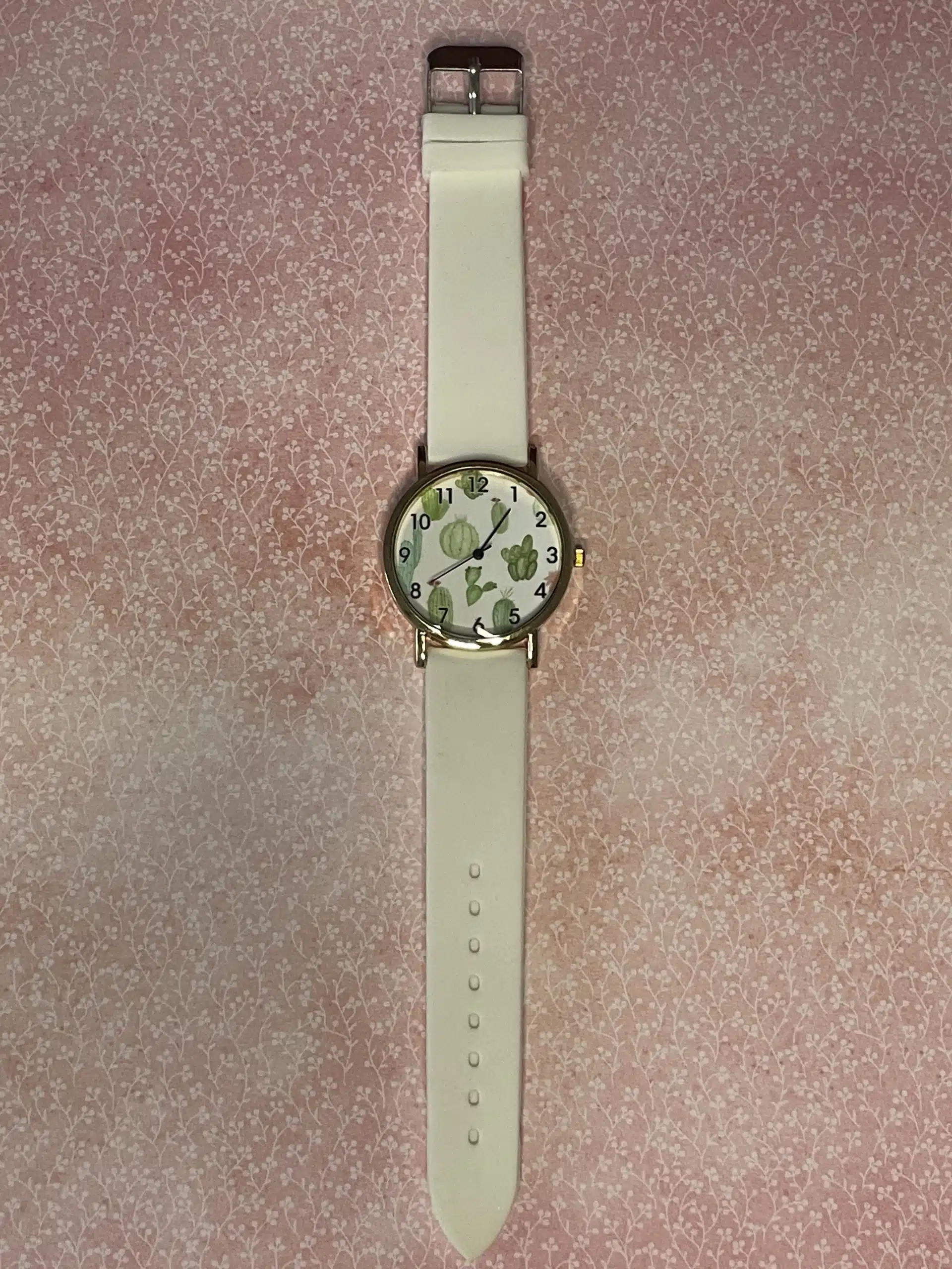 Affichez votre amour pour la nature avec cette montre fantaisie pour femme, mettant en scène des petits cactus dessinés au sein du cadran. Le boîtier rond, conçu en acier, mesure 32 mm de diamètre, s’associant parfaitement avec le bracelet en silicone blanc d’une largeur confortable de 20 mm. L’alliance de l’esthétique des cactus et du blanc pur du bracelet confère à cette montre un équilibre et touche d’originalité. Conçue pour celles qui désirent apporter une note à la fois chic et ludique à leur tenue, cette montre est une pièce neuve, incontournable pour votre collection d’accessoires.