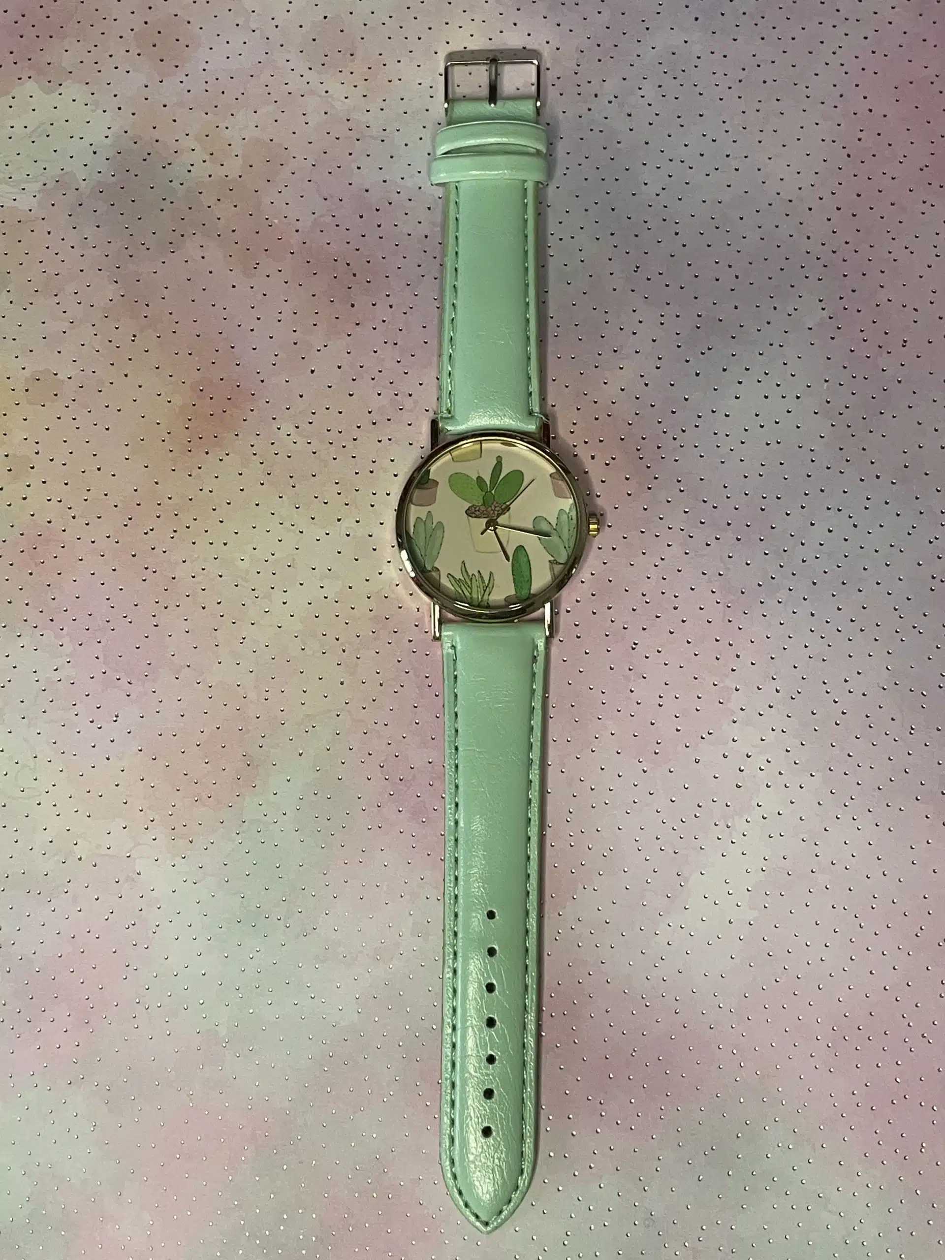 Embrassez une touche d’exotisme avec cette montre fantaisie pour femme, sublimée par de délicats petits cactus dessinés sur un cadran doré. Son boîtier rond en acier d’un diamètre de 38 mm est joliment mis en valeur par un bracelet en cuir vert d’une largeur de 18 mm. Cette montre, combinant charme désertique et élégance, est bien plus qu’un simple garde-temps ; elle évoque des aventures lointaines sous des cieux ensoleillés. Pour celles qui souhaitent apporter une note de fraîcheur et d’originalité à leur poignet, cette montre neuve est idéale.