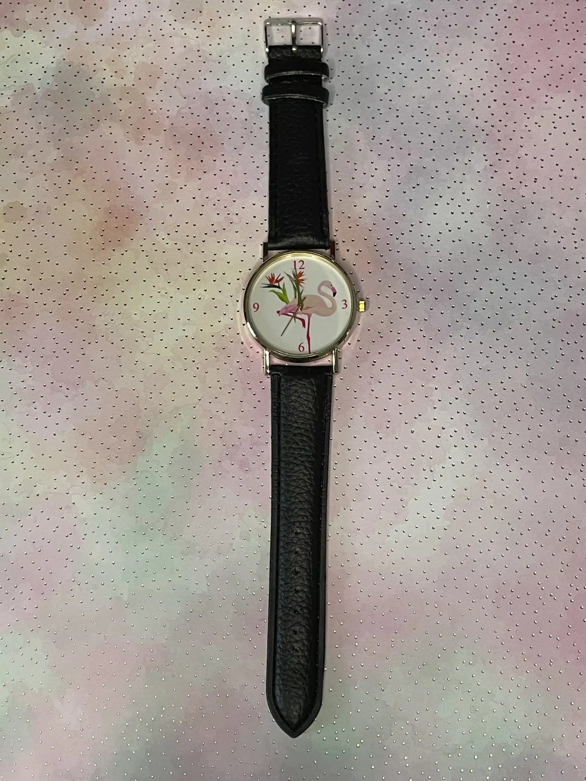 Plongez dans l’univers exotique avec cette montre fantaisie pour femme, ornée d’un magnifique flamant rose élégamment dessiné sur son cadran doré. Cette montre se distingue par son boîtier rond en acier de 36 mm, ainsi que par son bracelet en cuir de couleur noire, d’une largeur de 18 mm. L’association du noir et du doré offre une touche d’élégance intemporelle, tandis que le motif du flamant rose apporte une note d’originalité et de fraîcheur. C’est l’accessoire parfait pour toutes les femmes souhaitant allier raffinement et fantaisie. Produit neuf.