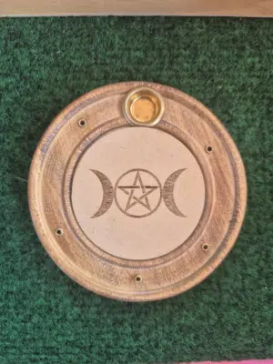 Apporte une dimension spirituelle et décorative à ton intérieur avec ce support d’encens Bois « Triple Moon & Star ». Fabriqué en bois naturel, diamètre d’environ 10 cm. Le motif gravé représente la triple lune (nouvelle pleine décroissante) symbolisant les cycles de vie et l’intuition féminine, accompagné d’une étoile évoquant la guidance et la protection.